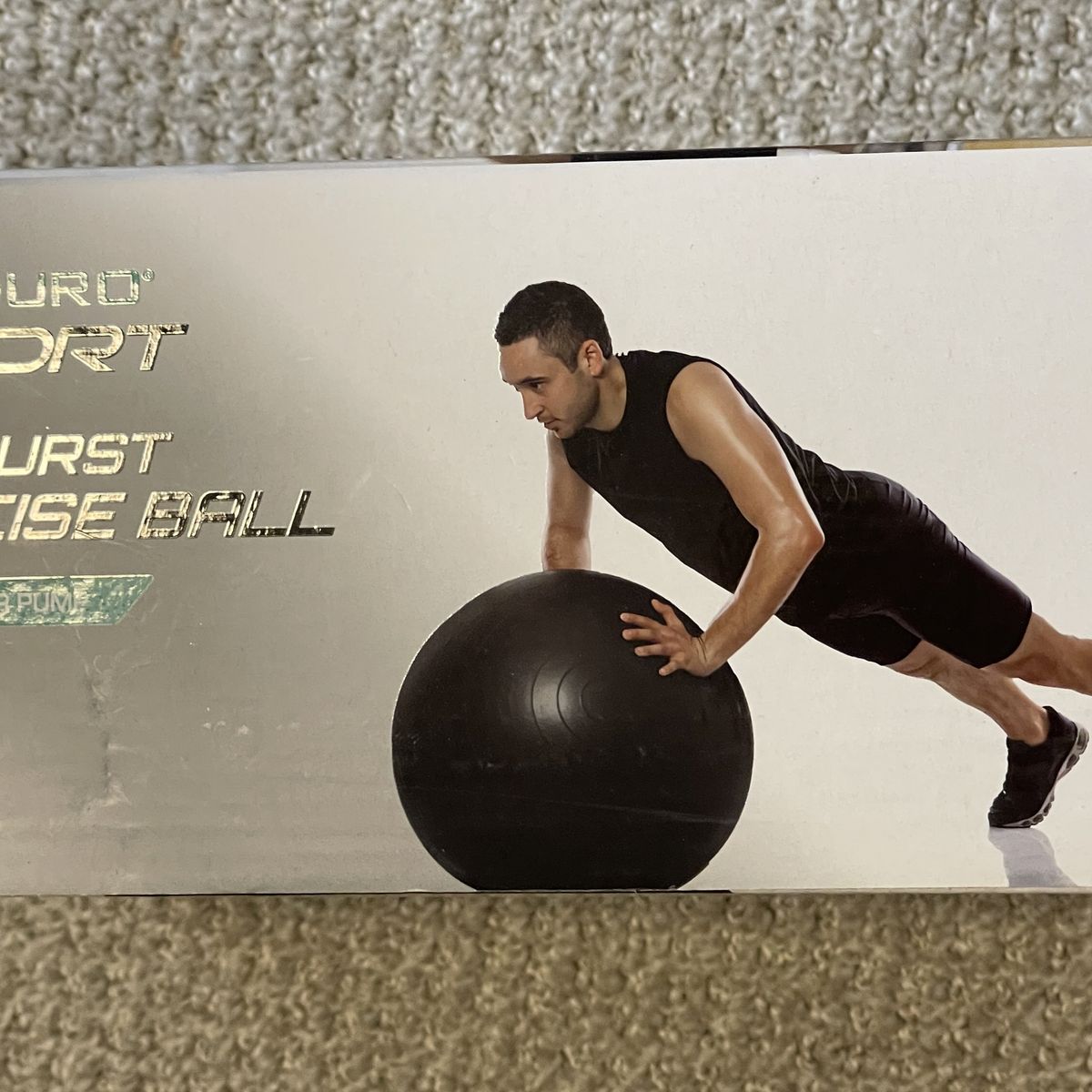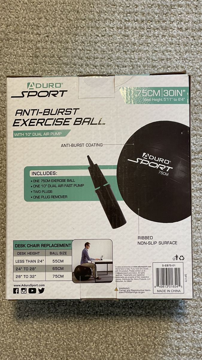 VenmoLike New Aduro Sport exercise ball, 75cm or 30 inches. Comes with a 10 inch dual air pump, two plugs, and a plug remover. Anti-burst coating and non-slip surface. Great for total body training or as a desk chair replacement.