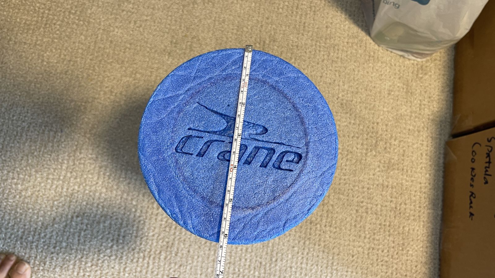 VenmoDurable foam roller. Blue color. Measures about 18 inches long. Diameter is around 6 inches. Great for stretching or muscle recovery.