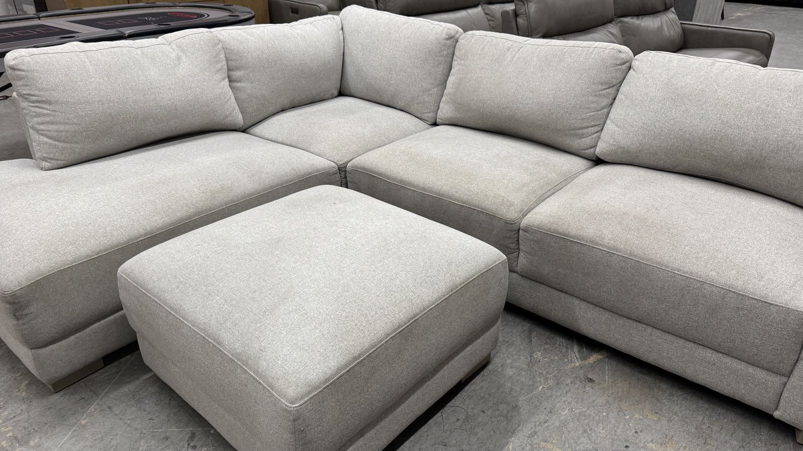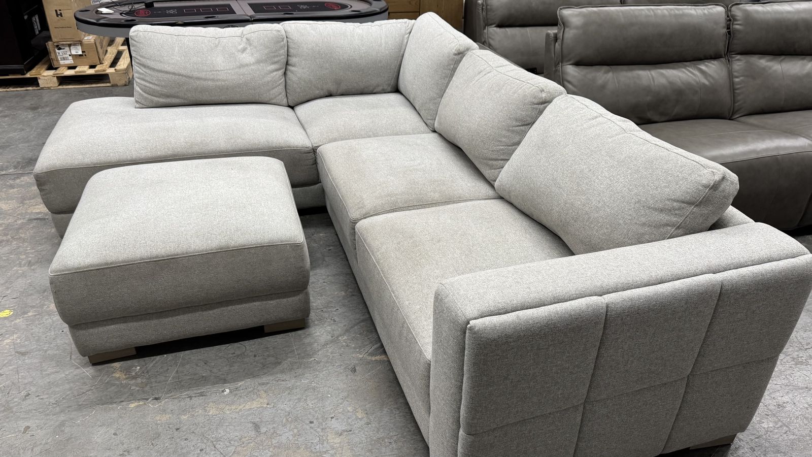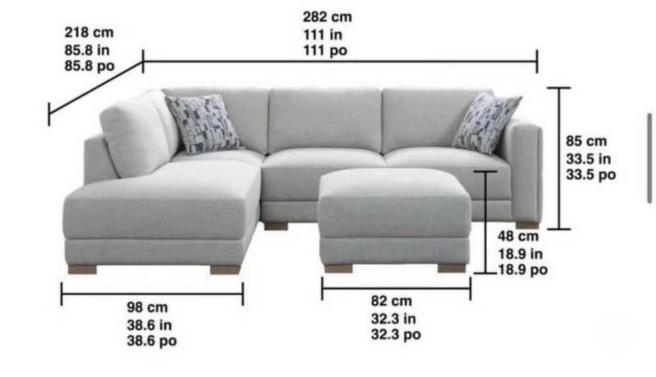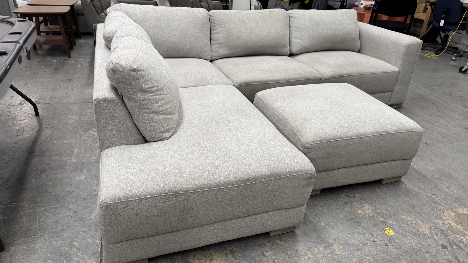 Synergy Home Furnishings Color Light Gray Costco Direct Costco Direct Number of Pieces 3 Piece No pillows Orientation Left Facing Ottoman Dimensions: W x L x H 32.3 in. x 32.3 in. x 18.9 in. Style Transitional Upholstery Material Fabric Sectional Dimensions Overall: 85.8 Lx 111 Wx33.5 H LAF Chaise: 85.8 L × 38.6 W × 33.5 H LAF Loveseat: 72.4 L × 38.6 Wx 33.5 H Ottoman: 32.3 L × 32.3 W x 18.9 H