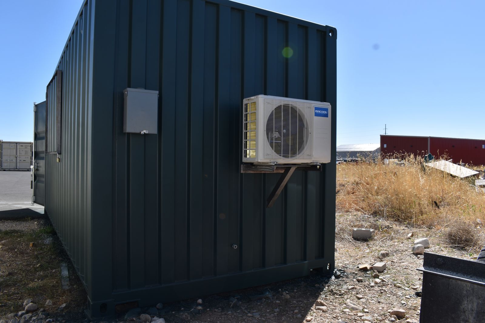 Inside, you’ll find white shiplap walls, pine ceilings, luxury waterproof Southern Oak flooring , recessed LED lighting, and a Mr. Cool ductless mini-split system for heating and cooling. Lots of outlets, and a sliding glass door with two big windows for natural light. The 3’ x 7’ closet is plumbed for easy conversion to a bathroom with water also able to go to the main room for a kitchen upgrade. The walls and ceiling are closed cell spray-foam insulated (R14 and R28), so it stays warm in winter and cool in summer. Custom fabricated steel shutters that make the entire unit fully lockable, protecting the windows and interior from weather and break-ins.