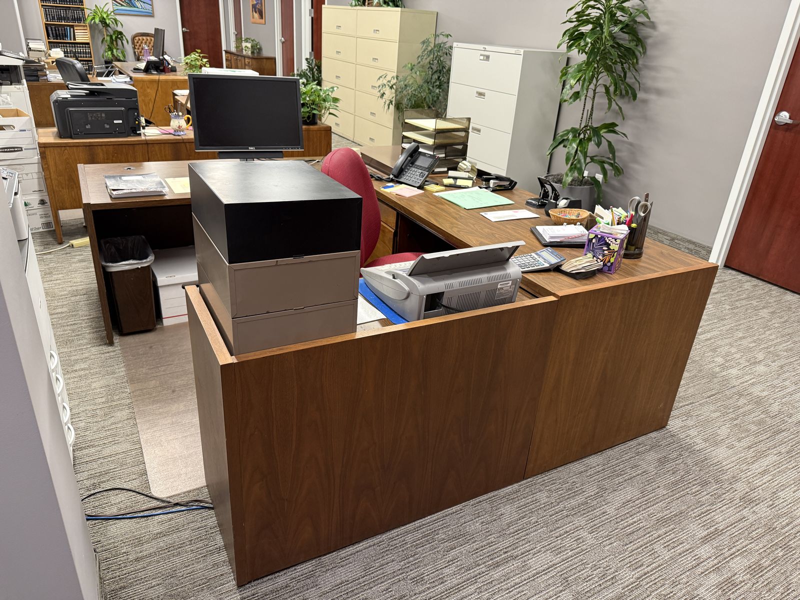 VenmoSecretary Desk with Right Hand Return. Desk is 59.25 inches wide; 30 inches deep; 29 inches high. The right hand return (attached to the desk) is 40 inches long, 15 inches deep; and 26-29 inches high. Thy are Kimball office furniture.