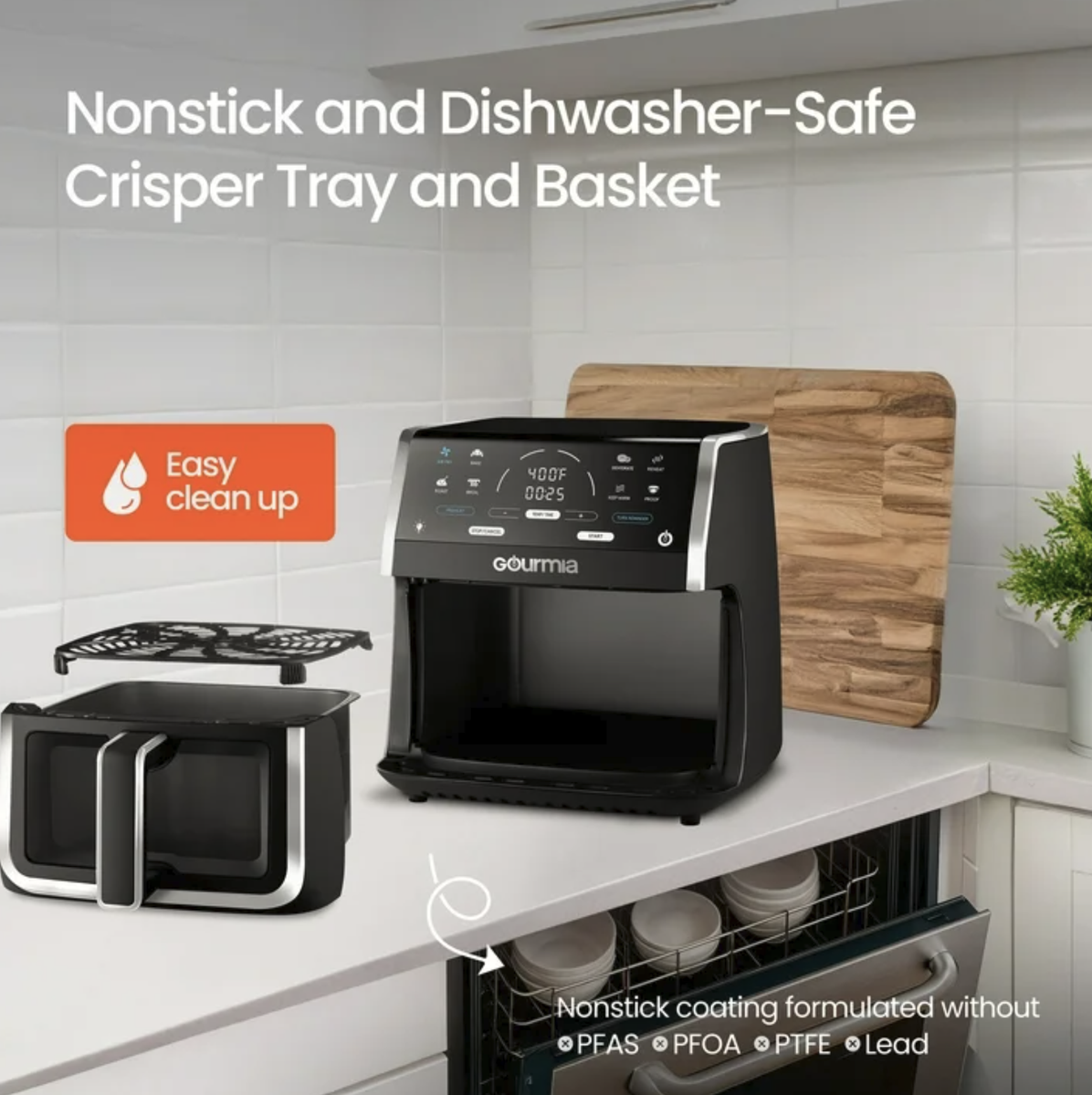 Dishwasher-safe nonstick basket and crisper tray for easy cleanup