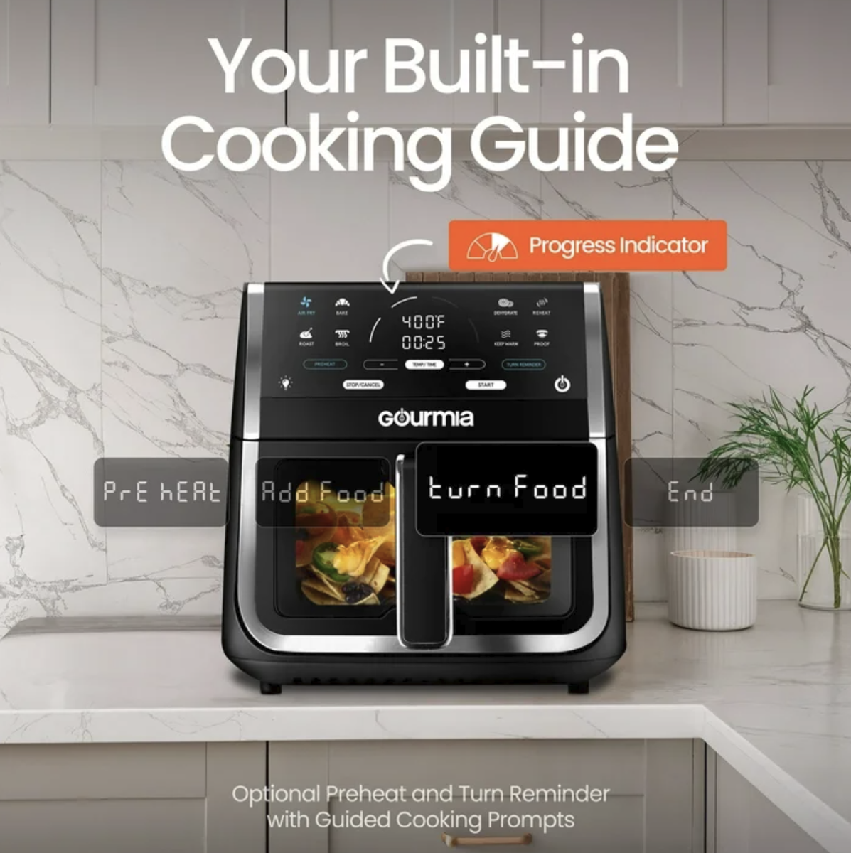 An optional Preheat and Turn Food Reminder achieve delicious results