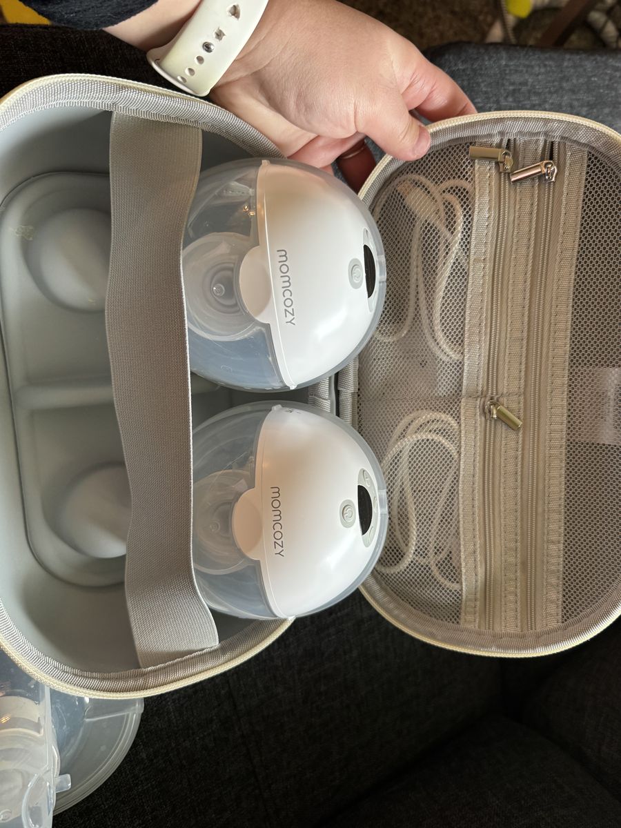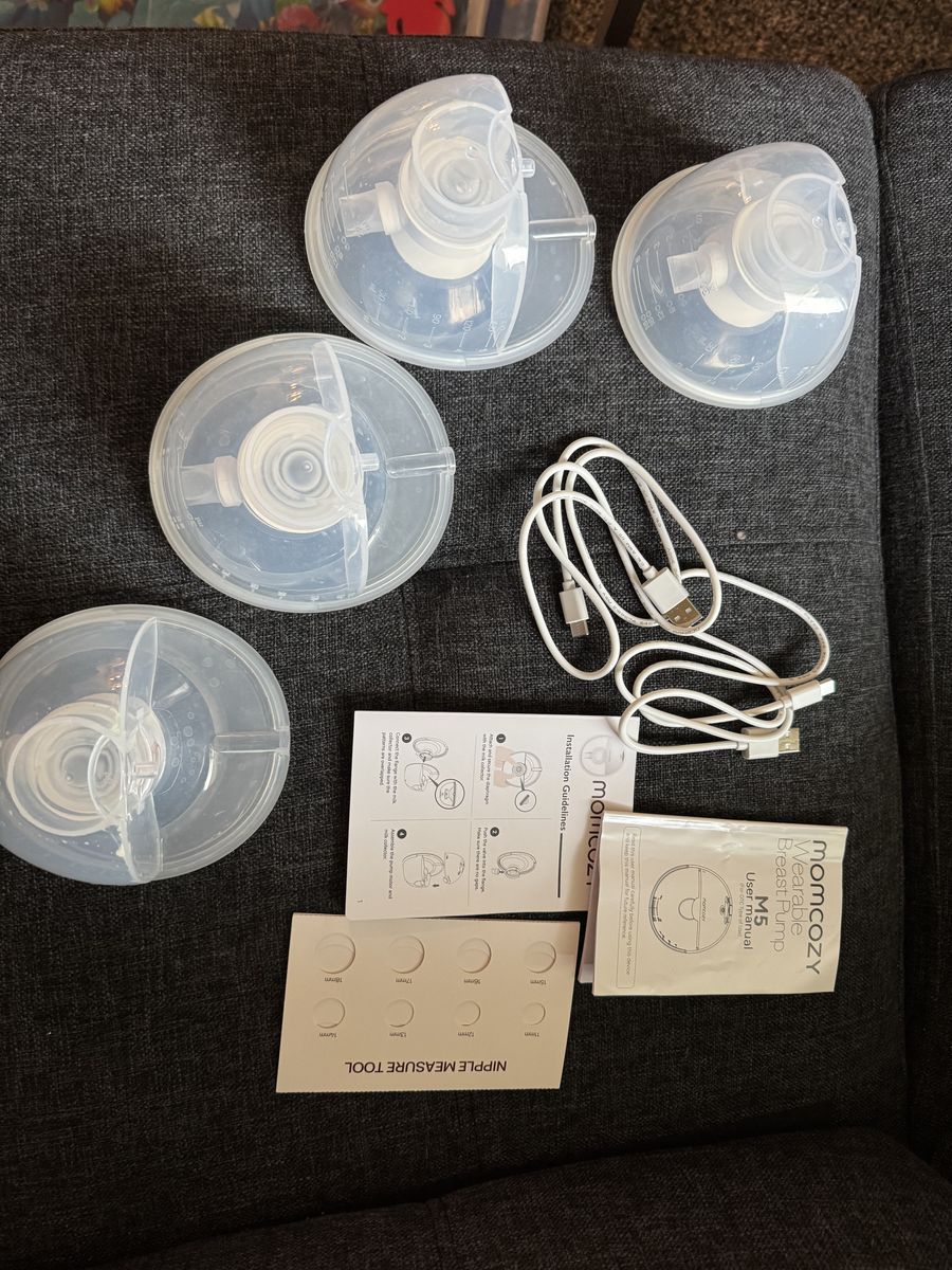 ApplePayMomcozy M5 lightly used (about 2 months). Includes original case, charger, and 4 extra collectors. Everything is clean and works perfectly. You would just need your right flange size inserts.
