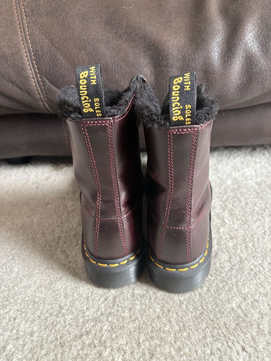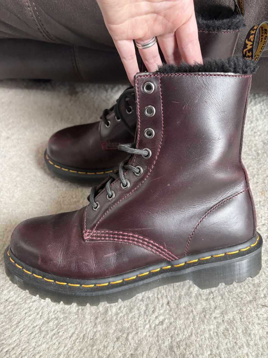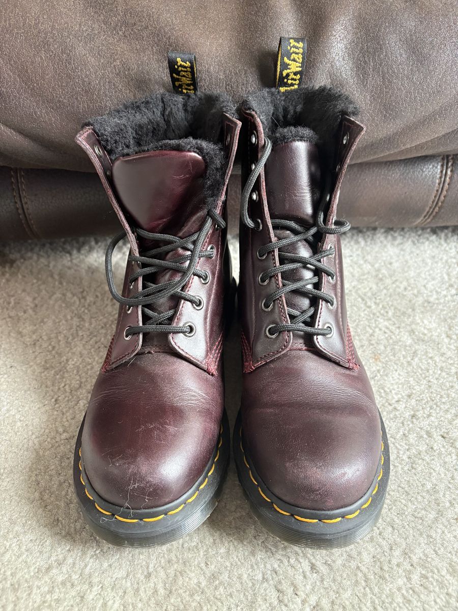 VenmoWaterproof burgundy doctor martens! They are faux fur lined and comfy. These are well loved and fit great for a size 8. I would have loved to keep these if my feet didn't grow a size. Open to offers