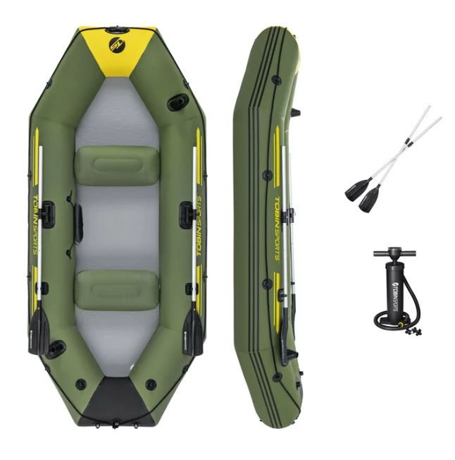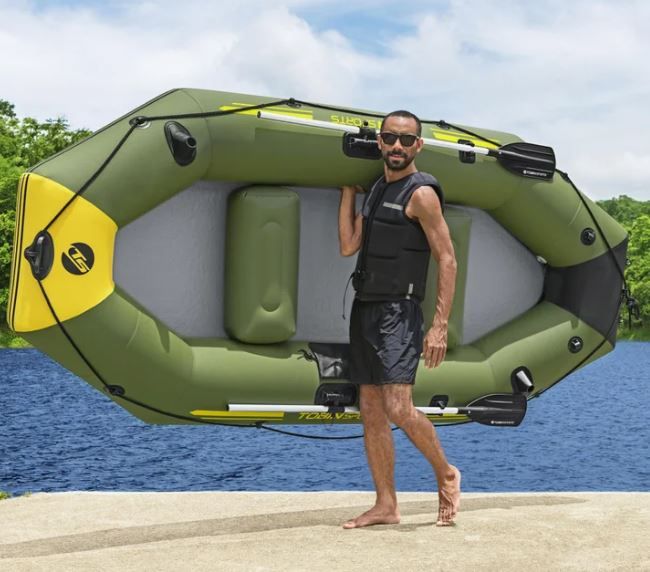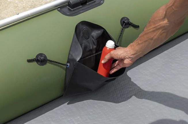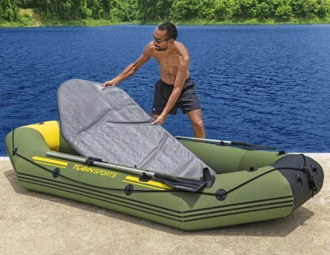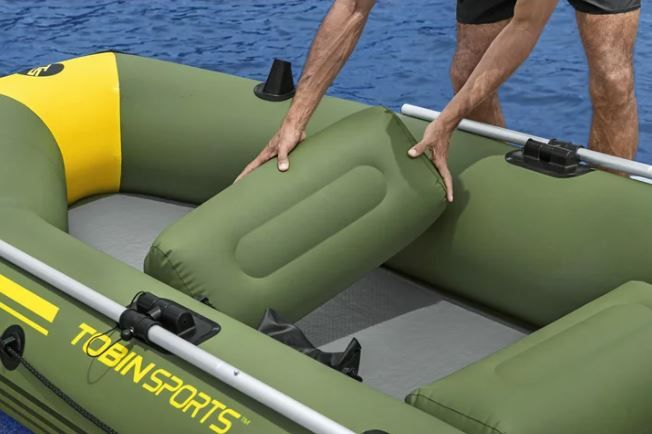 What’s Included Inflatable boat Drop-stitch floor 2 inflatable seat cushions One aluminum oars (Missing 1 of the 2) Hand pump Gear/storage pouch