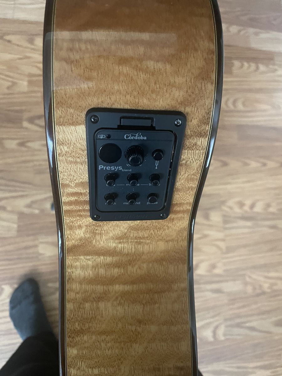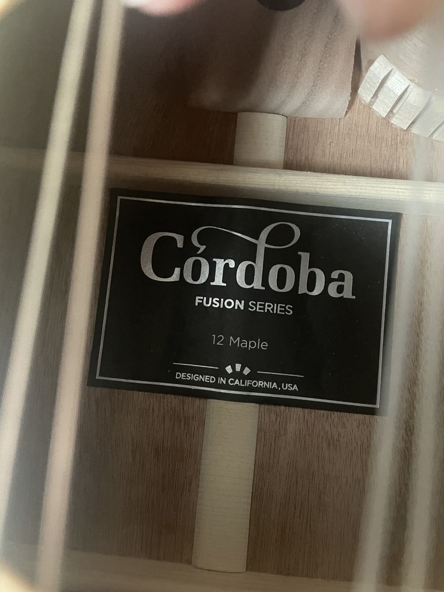 "Cordoba's Fusion 12 Maple features a lovely figured maple back and sides, which provides extra punch and extraordinary high-end sparkle. It's a great combination with the European spruce top, which has excellent projection and vibrance. You'll love the great sustain and detail of the Fusion 12 Maple's tone"