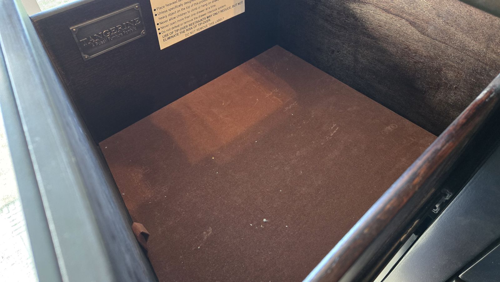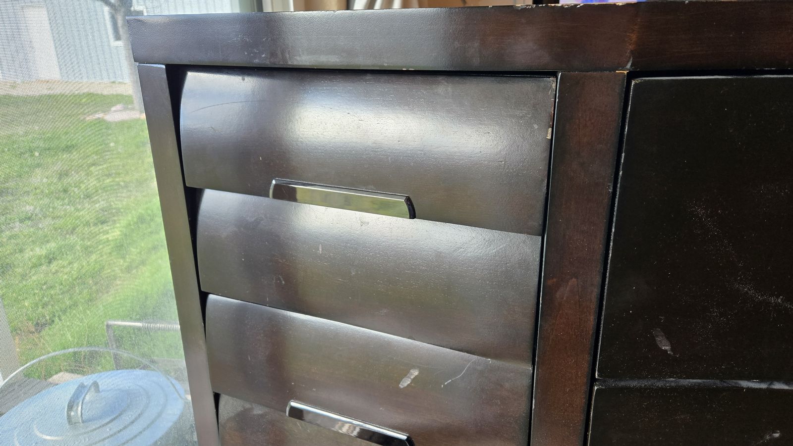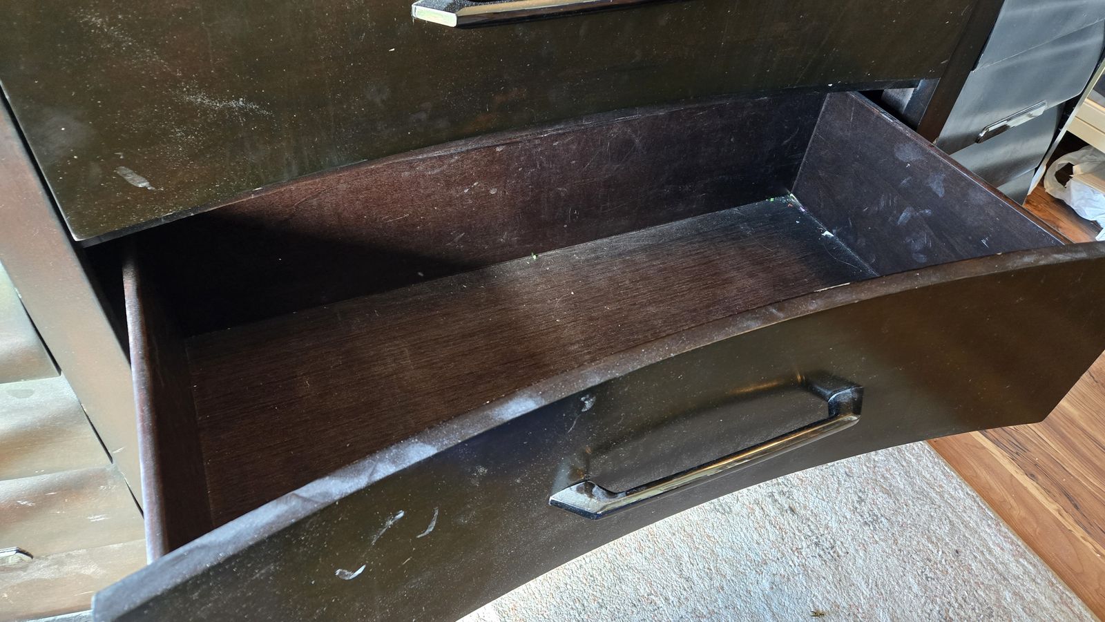 VenmoThis is part of the Sable bedroom set from the Tangerine line of Pulaski Furniture. It has a total of 9 pull drawers (6 small and 3 large). It is made with cherry veneers and finished in a dark sable finish. The soft bow fronts of the panels use smokey nickel hardware. There are some minor scratches on the top but otherwise in good condition.