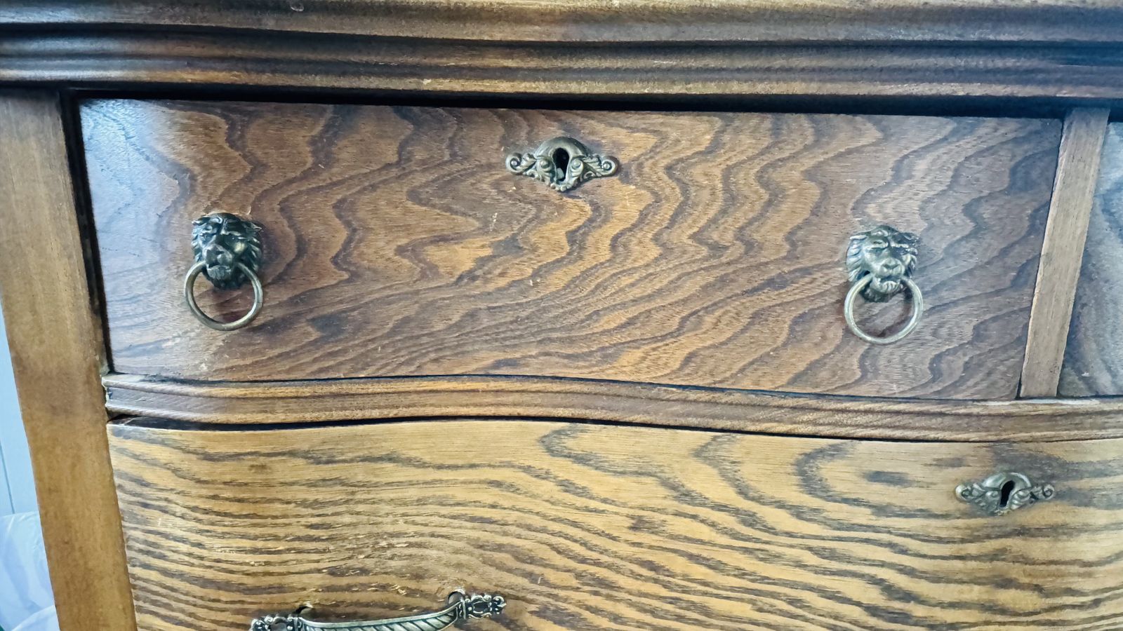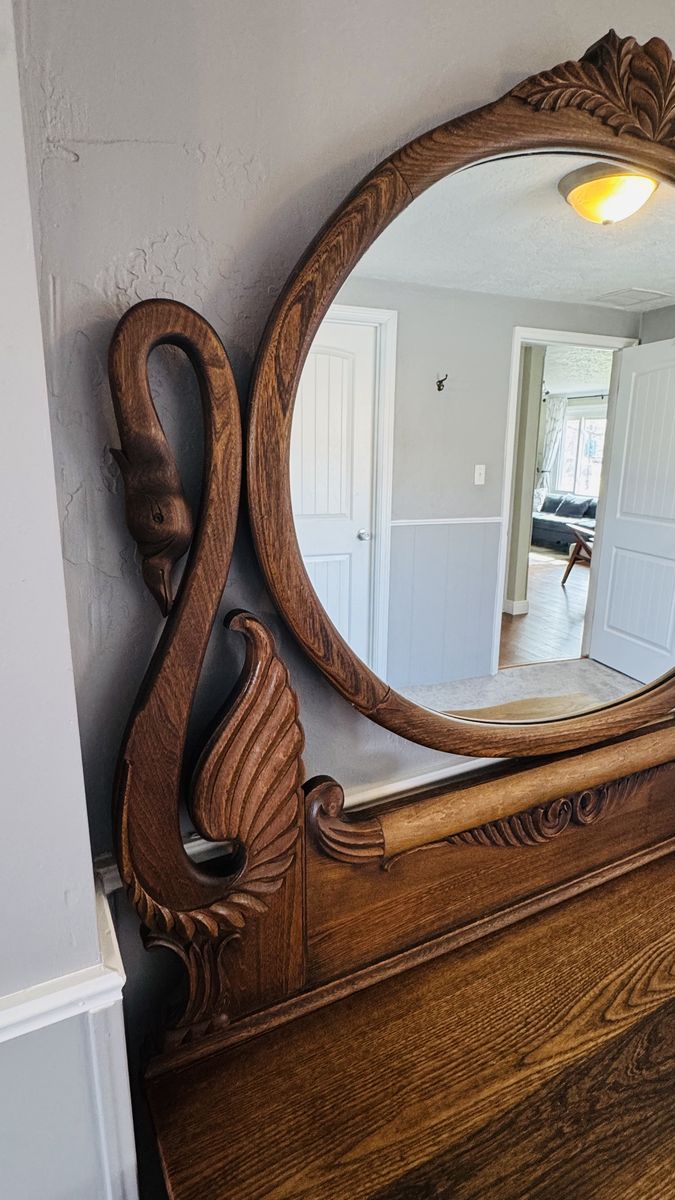 CashAppBeautiful 4 drawer antique dresser. Carved swans holding the mirror on, lion handle pulls. Dimensions: 69” tall x 42” wide x 25” deep