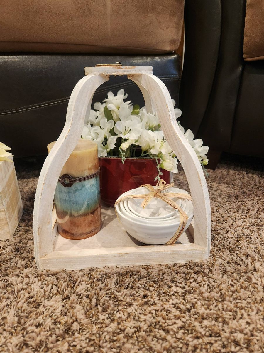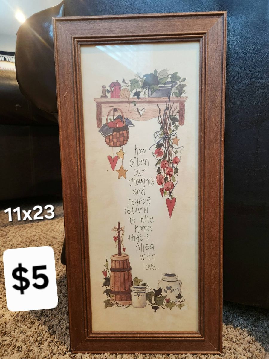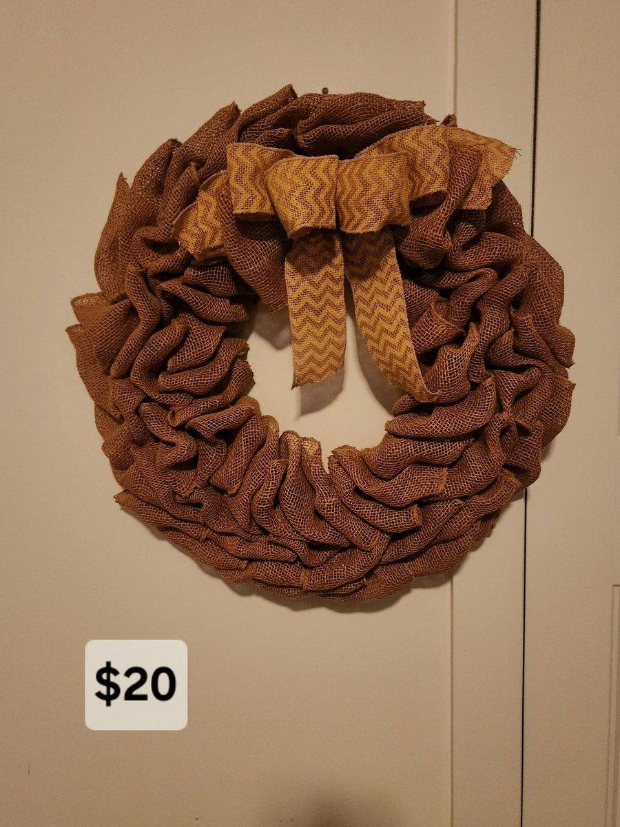 VenmoShelf and wall decor, burlap wreath, shelf with mounts (brand new), iron rod wall decor, shower curtain and liner, pic frames (soom brand new)- sizes and prices in pics.
