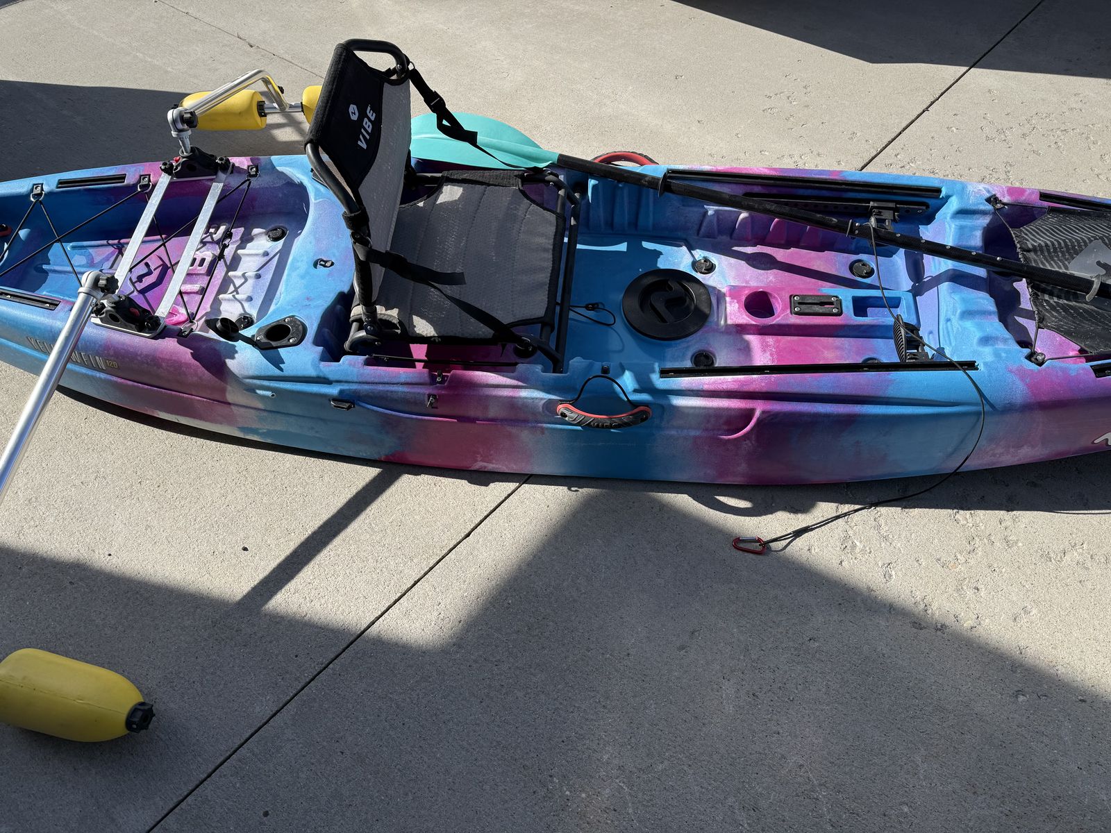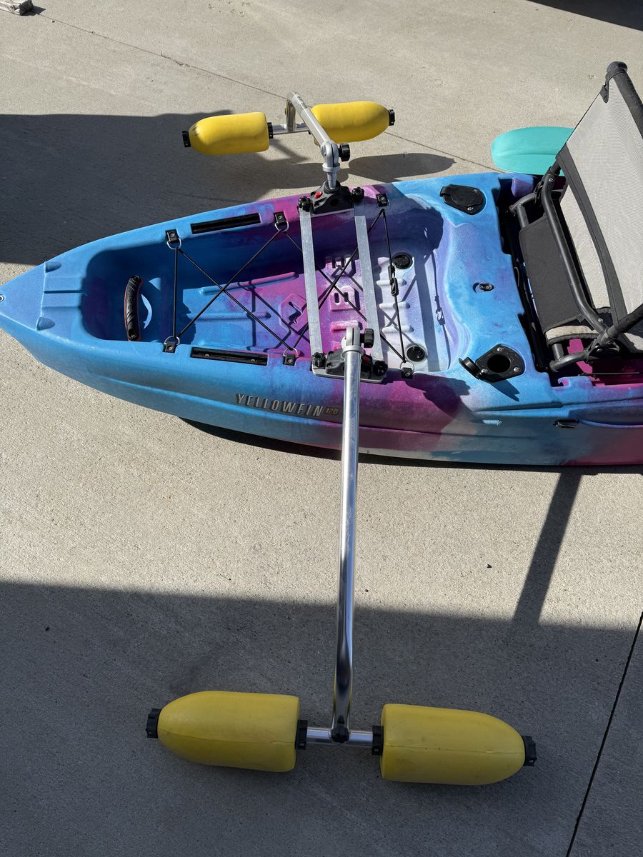 VenmoVibe yellowfin 120 kayak 12’ long 33” wide Weight 66 lbs Holds up to 400 lbs Fast Stabile Includes lightweight paddle And outrigger stability kit