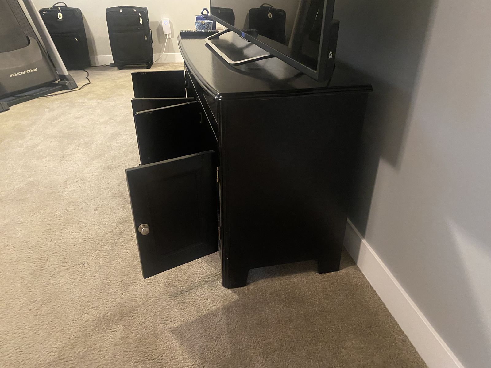 Dark brown TV stand . 20" deep, 50" long and 29" high.