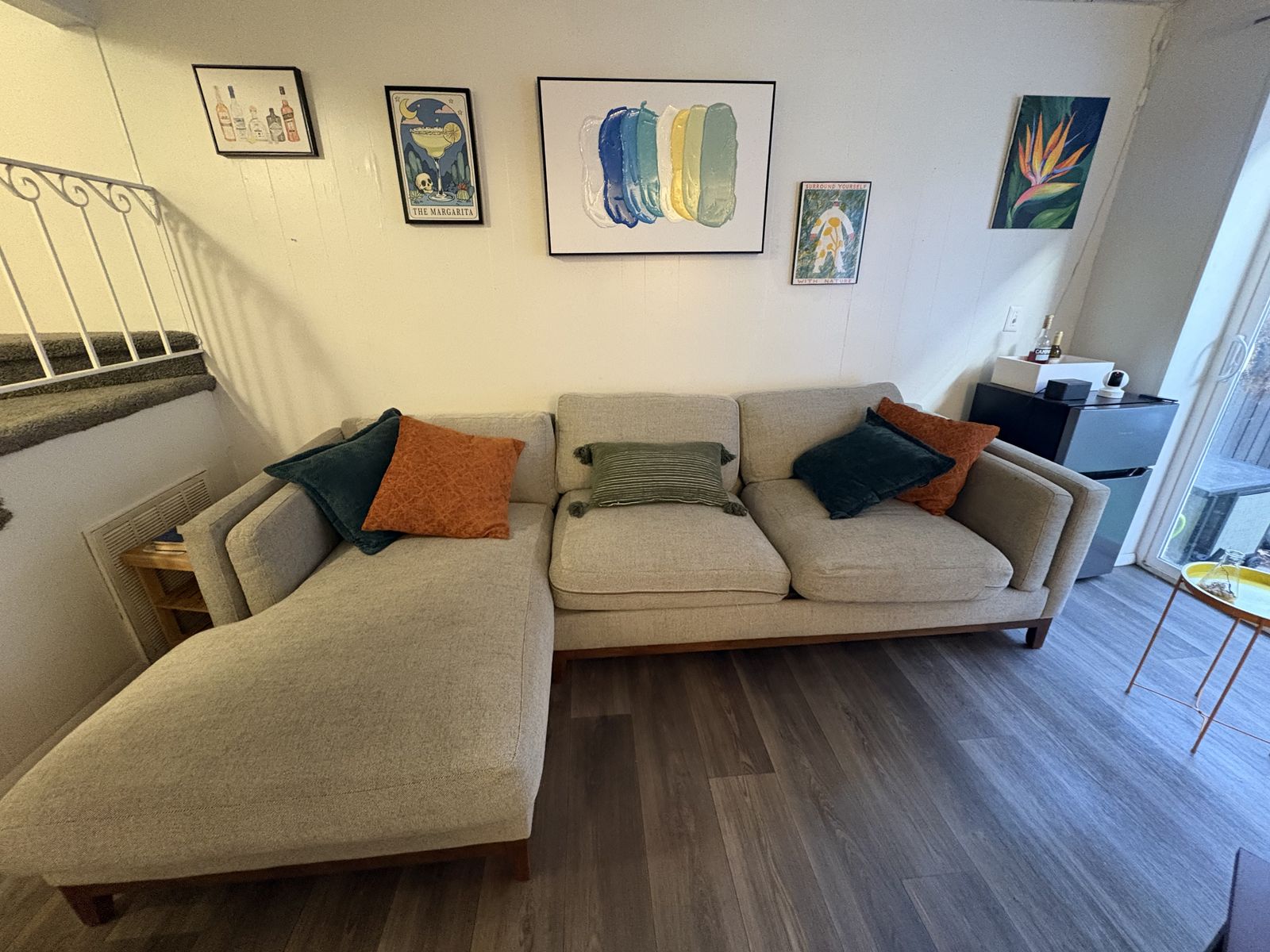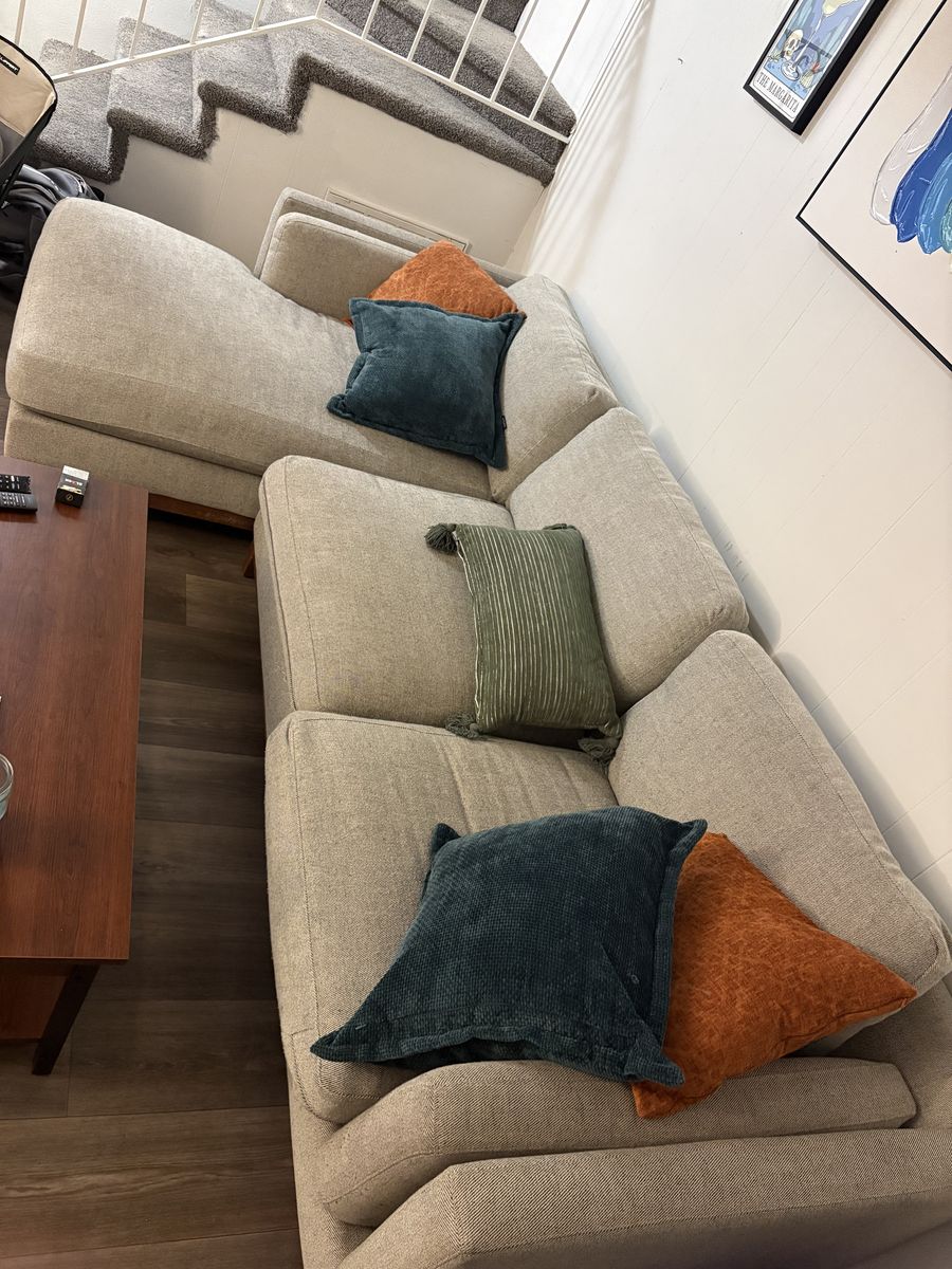 ApplePayThis has been a great couch for me! I’m the second owner, it’s originally from RC Wiley and is in really good condition. This couch is from a dog home, but the covers are removable and have been washed regularly since purchase. There is one small stain about the size of a dime. Dimensions are 9'3 back length 3'2 non chaise width 5'3 chaise side width 2'3 height. Willing to sell the pillows with it for an additional $50. This is a great deal and couch, I’m just moving and have to downsize!
