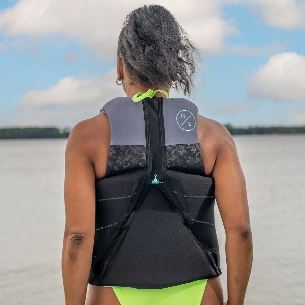 The Hyperlite Women's Life Vest is a US Coast Guard and Transport Canada approved Type III Personal Flotation Device designed specifically for women. This CGA-certified Level 70 buoyancy aid features hinged construction with segmented foam panels for maximum flexibility and comfort on the water. The vest incorporates Hyperlite's proprietary Fluid Flex technology and TrueFit 4 fit system, creating supremely engineered flex segments that are incredibly breathable, flexible, and lightweight. The Biolite exterior material reduces irritation and provides durability, while concealed 1.5-inch straps ensure a secure fit. Wide neck and arm holes offer unrestricted movement, making this the most comfortable women's life vest for wakeboarding, waterskiing, paddleboarding, and other water sports activities.