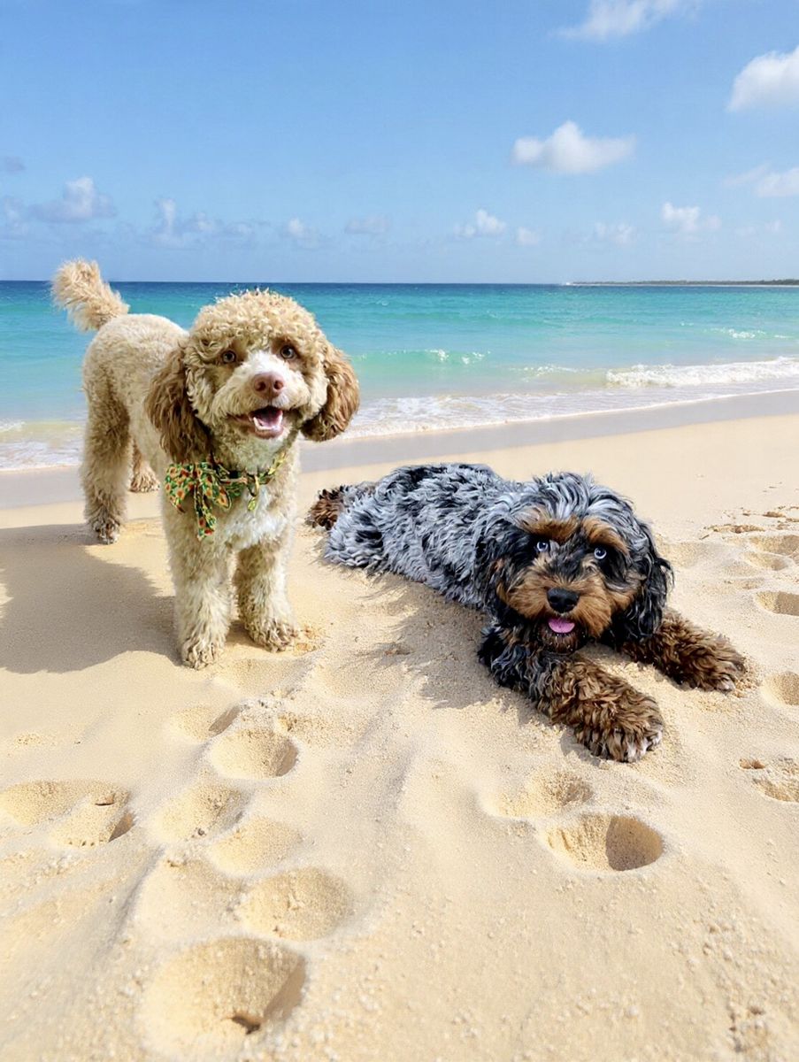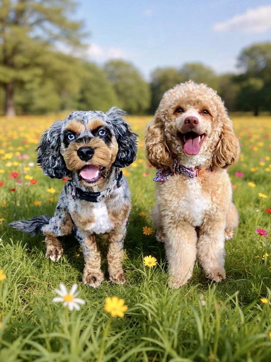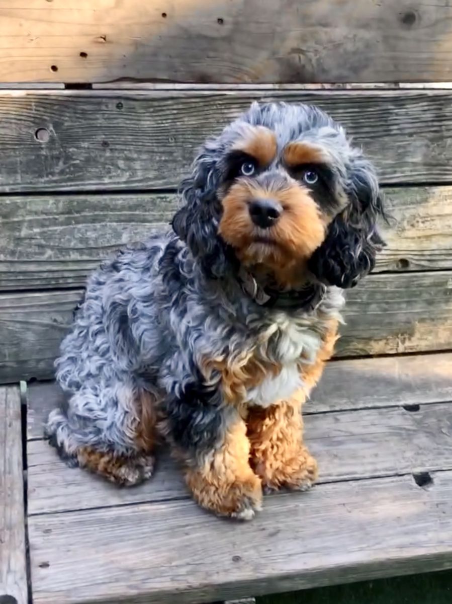 Dad, Umami, is a striking 20 lb. blue merle phantom abstract mini Cockalier Poo. Always turning heads with those captivating blue eyes! Umami is the perfect mix of both loving, affectionate, ready for fun but very chill and laid back. Only 30% poodle, Umami has a unique mix of handsome Cocker/Cavalier structure with the furnishings and low shedding curls of a Cockapoo.
