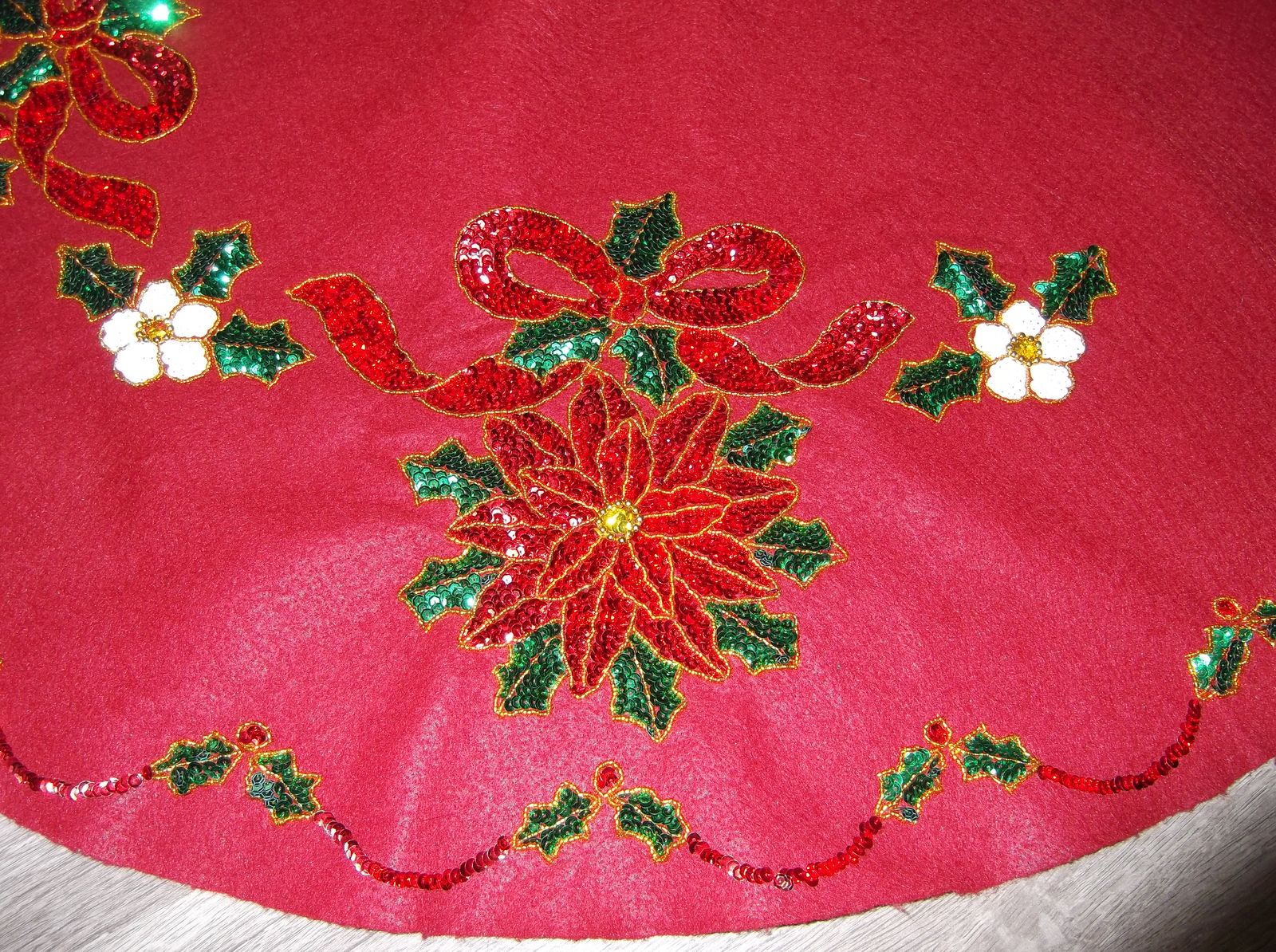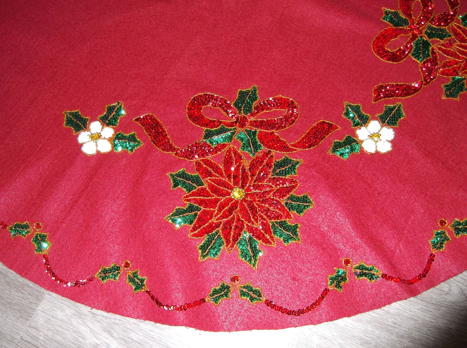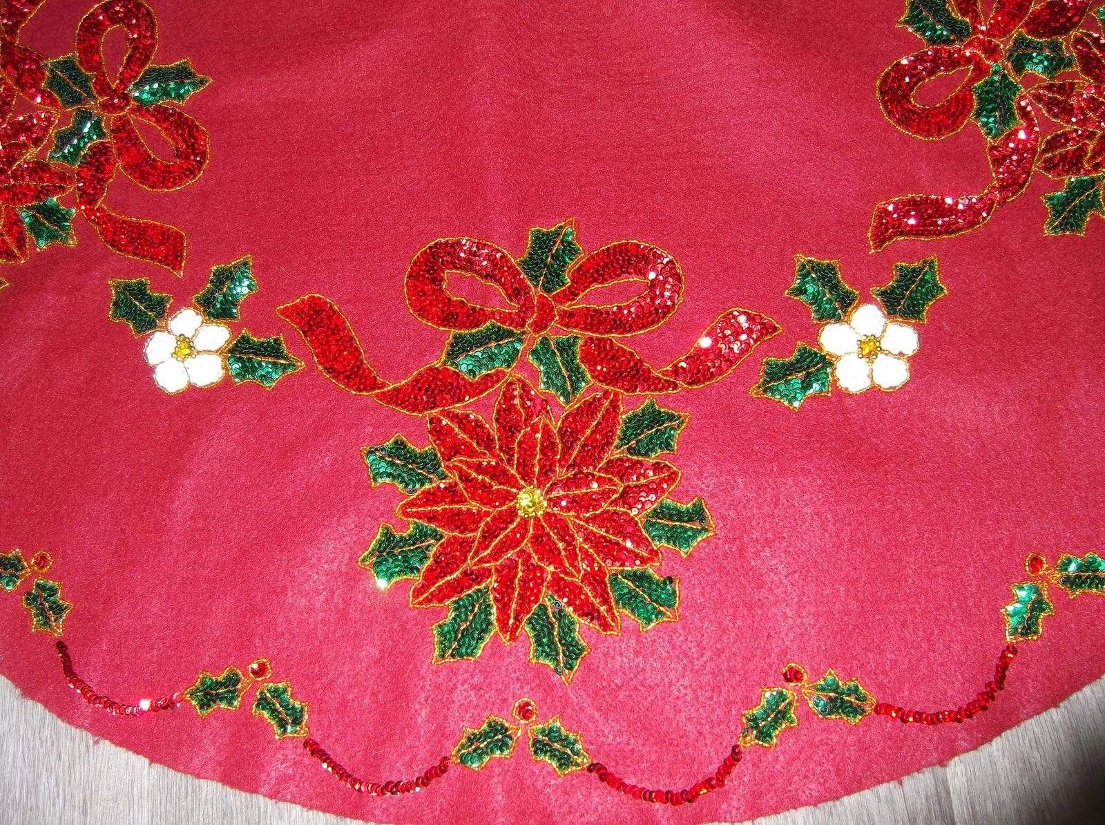 LOVE POINSETTIAS? THEN WRAP SOME POINSETTIAS AROUND YOUR CHRISTMAS TREE. The tree skirt is a maroon felt tree skirt covered in sequins and gold beads lovingly done by hand. It measures 42” in a diameter with a 6.25” center opening to wrap around your tree.