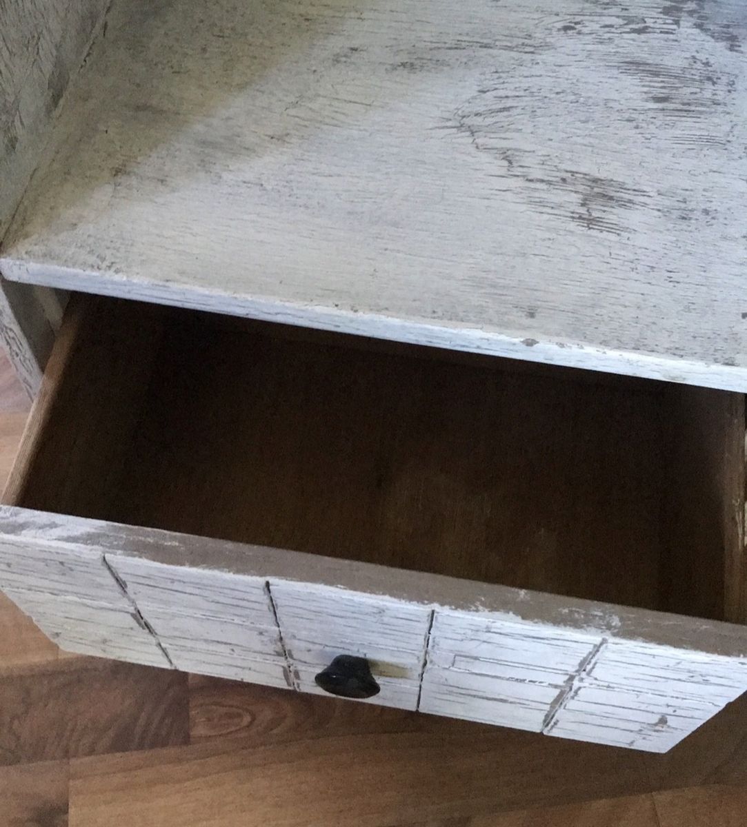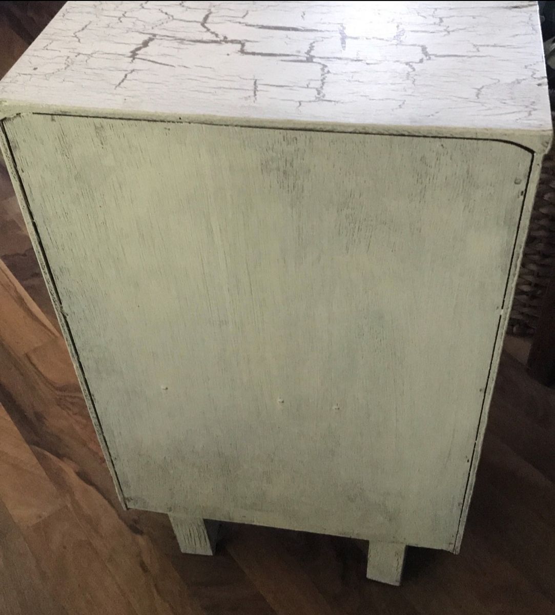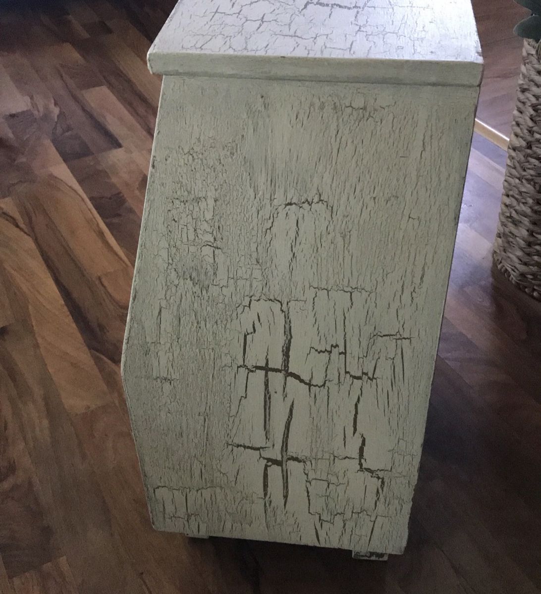 This was hand painted with a crackle finish. It’s painted a tan color with a cream color on top. Very shabby-chic, farmhouse, cottage-core, or vintage.