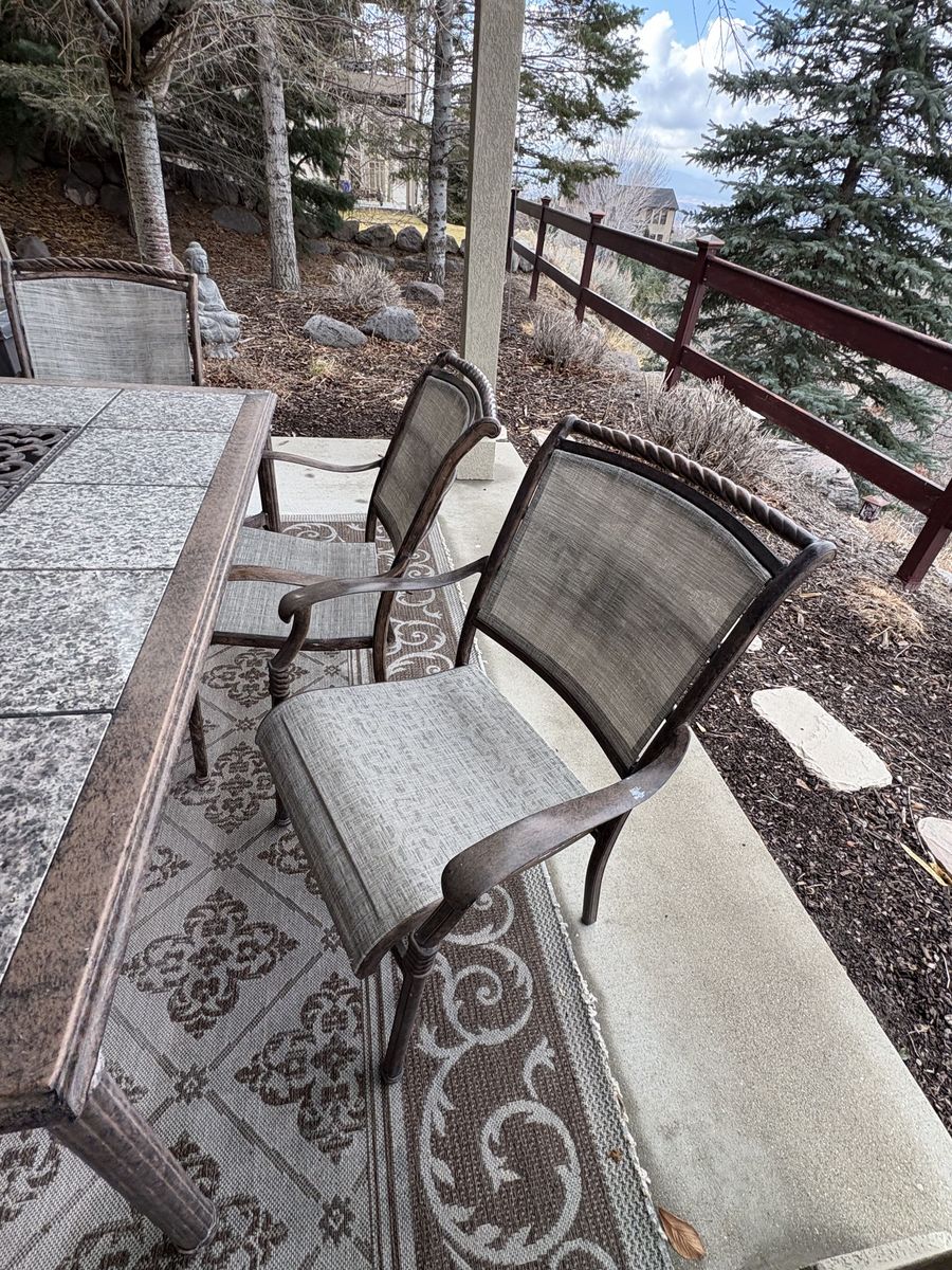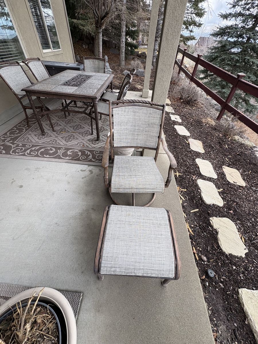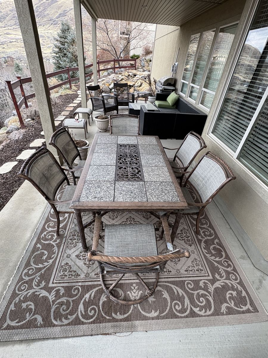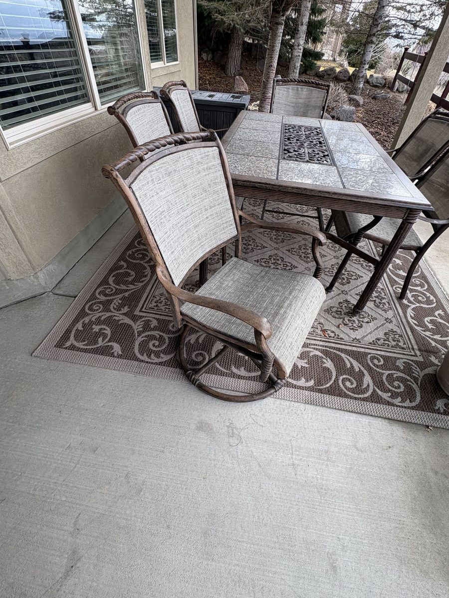 VenmoComes with 2 swivel arm chairs and ottomans, dining table, and 4 arm chairs. Table measures 67.25" x 42.5" x 29.5" tall. Chairs measure 27" wide x 28" deep x 37" tall back. Floor to seat 17" tall. $1200 for everything. In Draper by the Draper temple.