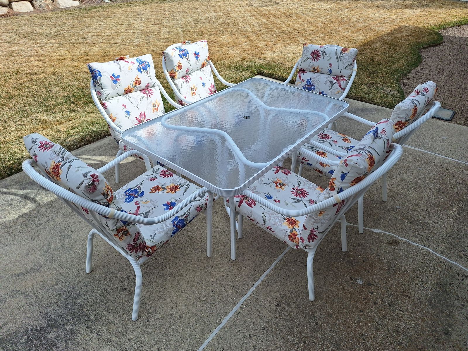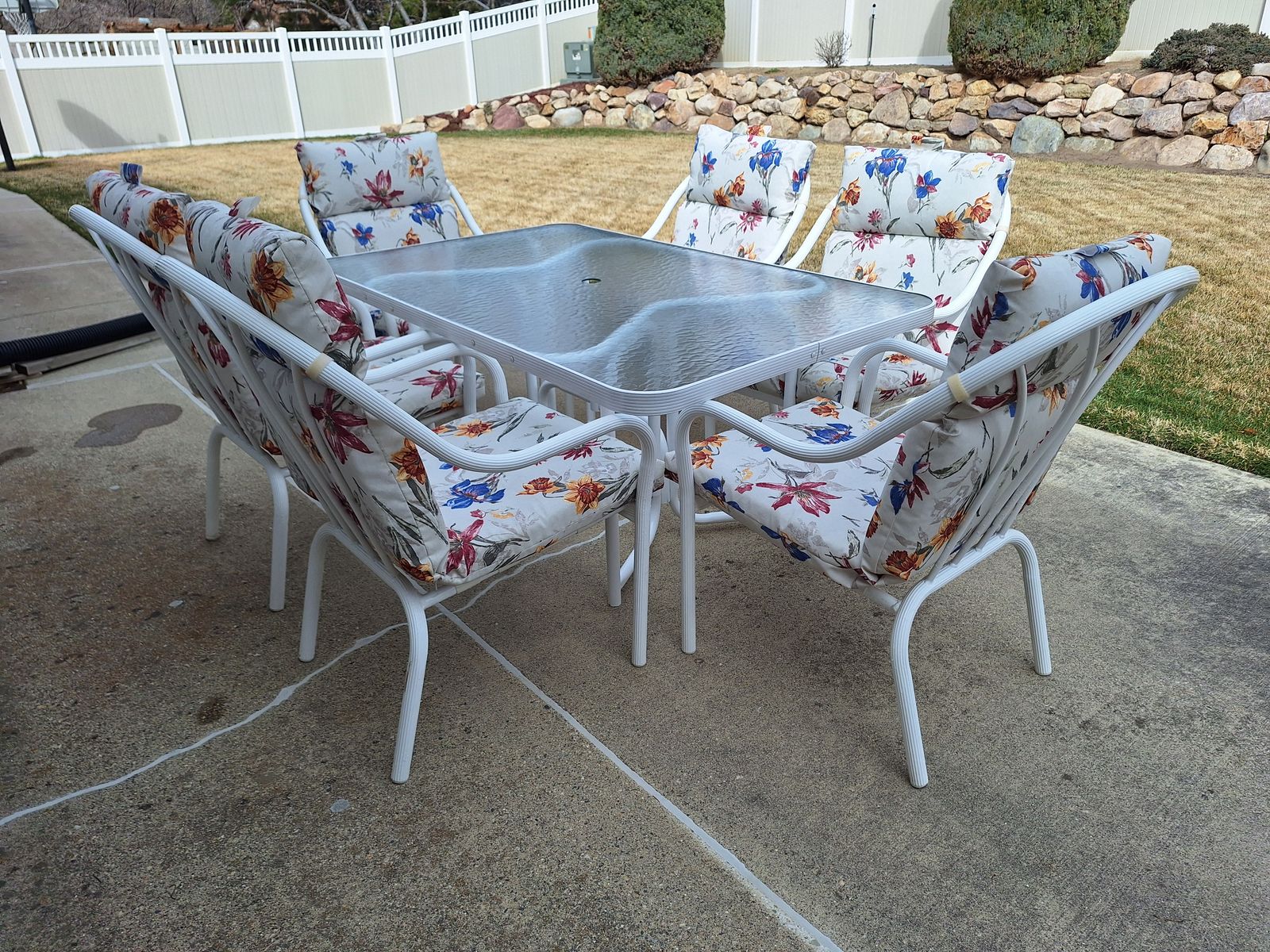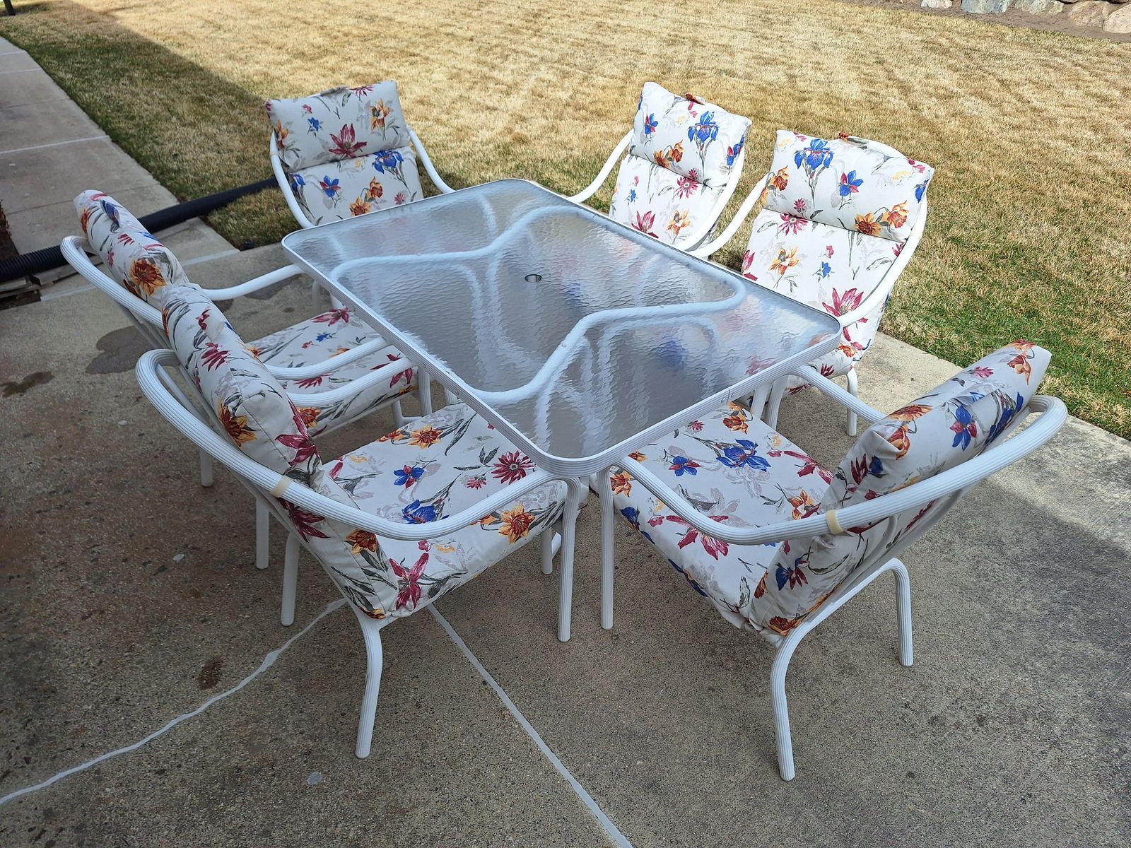 VenmoPerfect like new condition. Super Clean. Includes table with tempered glass table top, six chairs and six chair cushions. Table dimensions are 60"L x 37"W. Glass table top and tabel frame below includes a 2" diameter hole for an umbrella.
