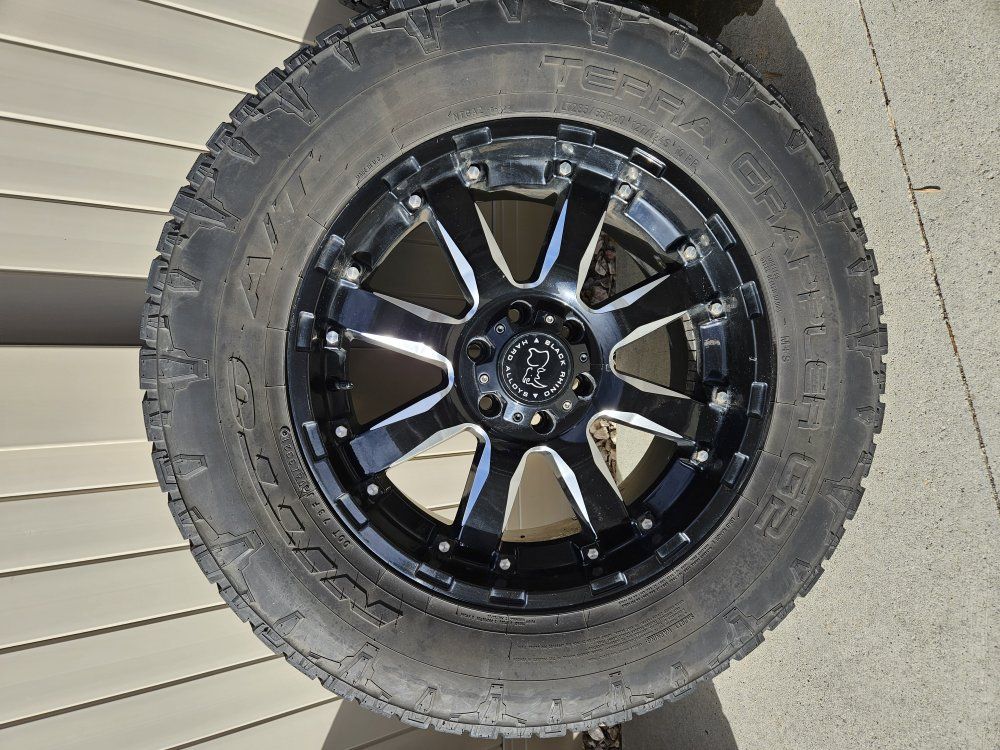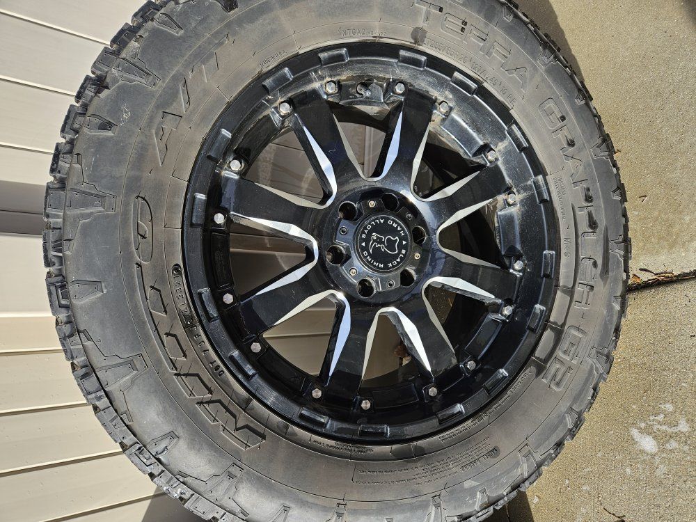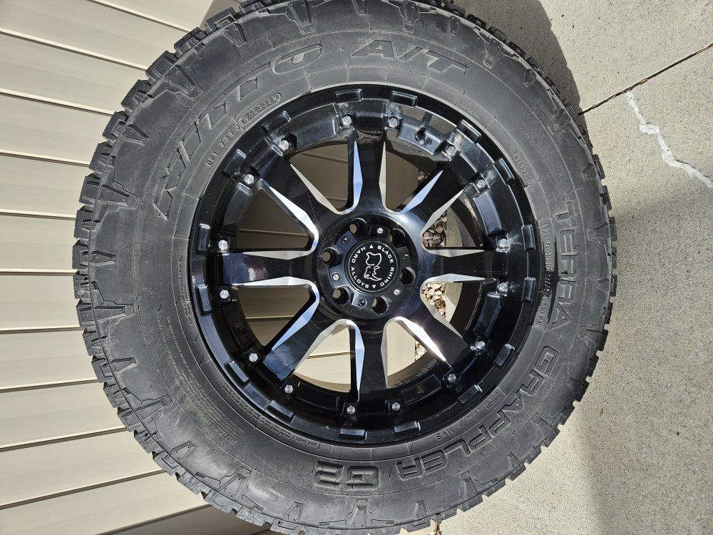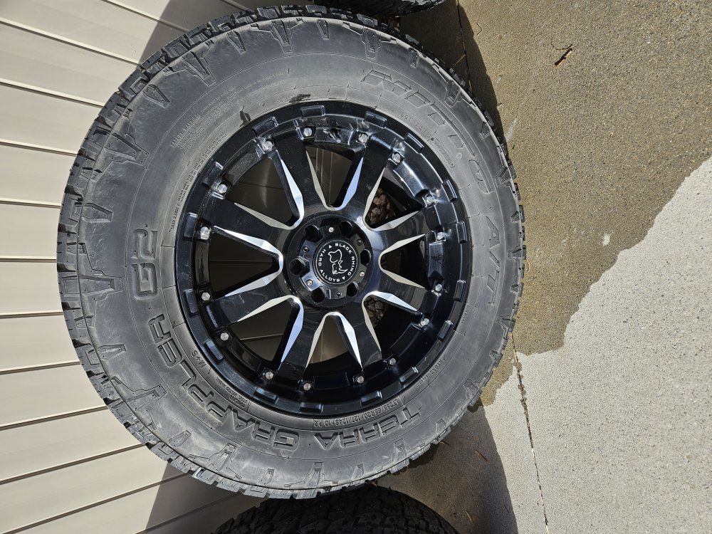 20x9 6x135mm wheels, Ditto Terra Grappler tires 285/65/20. Tires still have a lot of tread.