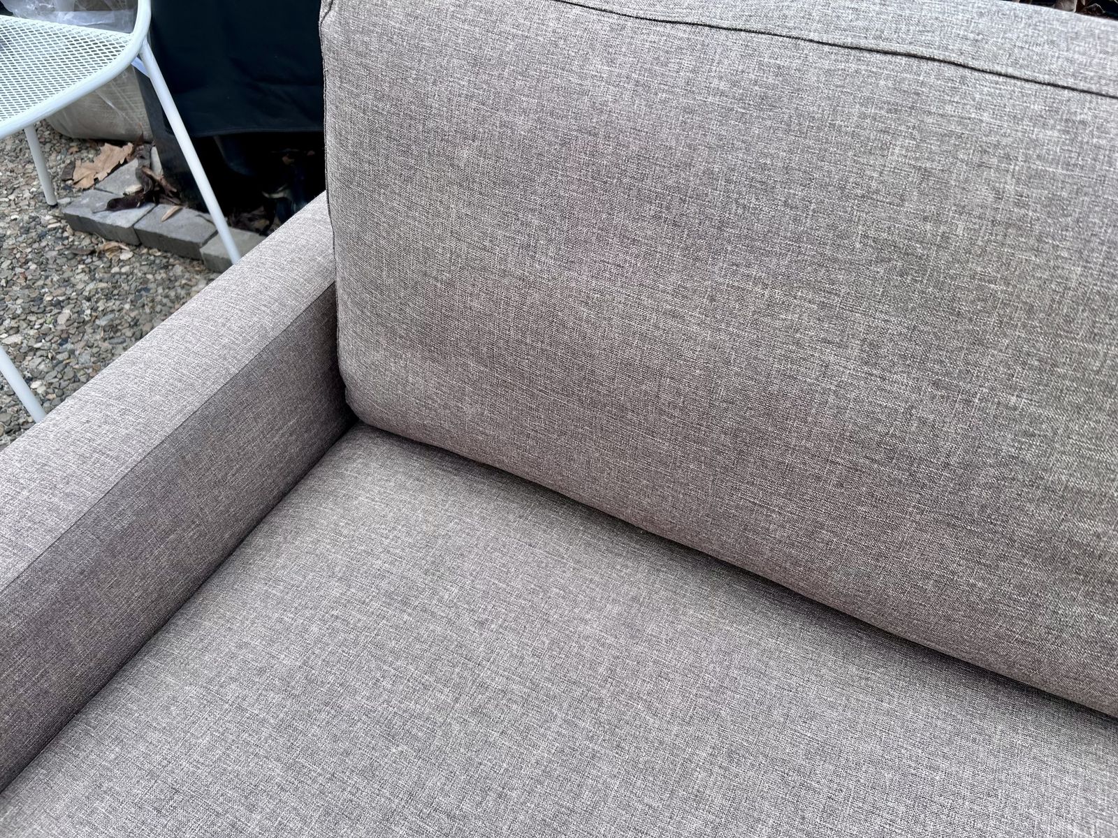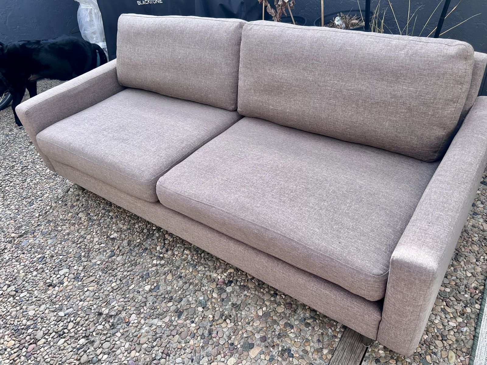 ApplePayHello! I’m parting with a 2016 brown sofa from Crate and Barrel (sorry I can’t find the original listing). It measures 78 in. wide x 32 in. high x 36 in. deep, with metal legs. It’s been in storage the last few years, the cushions aren’t saggy, there are no stains on the fabric, and it's recently cleaned — the only reason I listed it as “normal wear” versus “minimal wear” is the stapled cloth on the bottom started to fray so I removed it. Otherwise this is a good, modern looking couch!