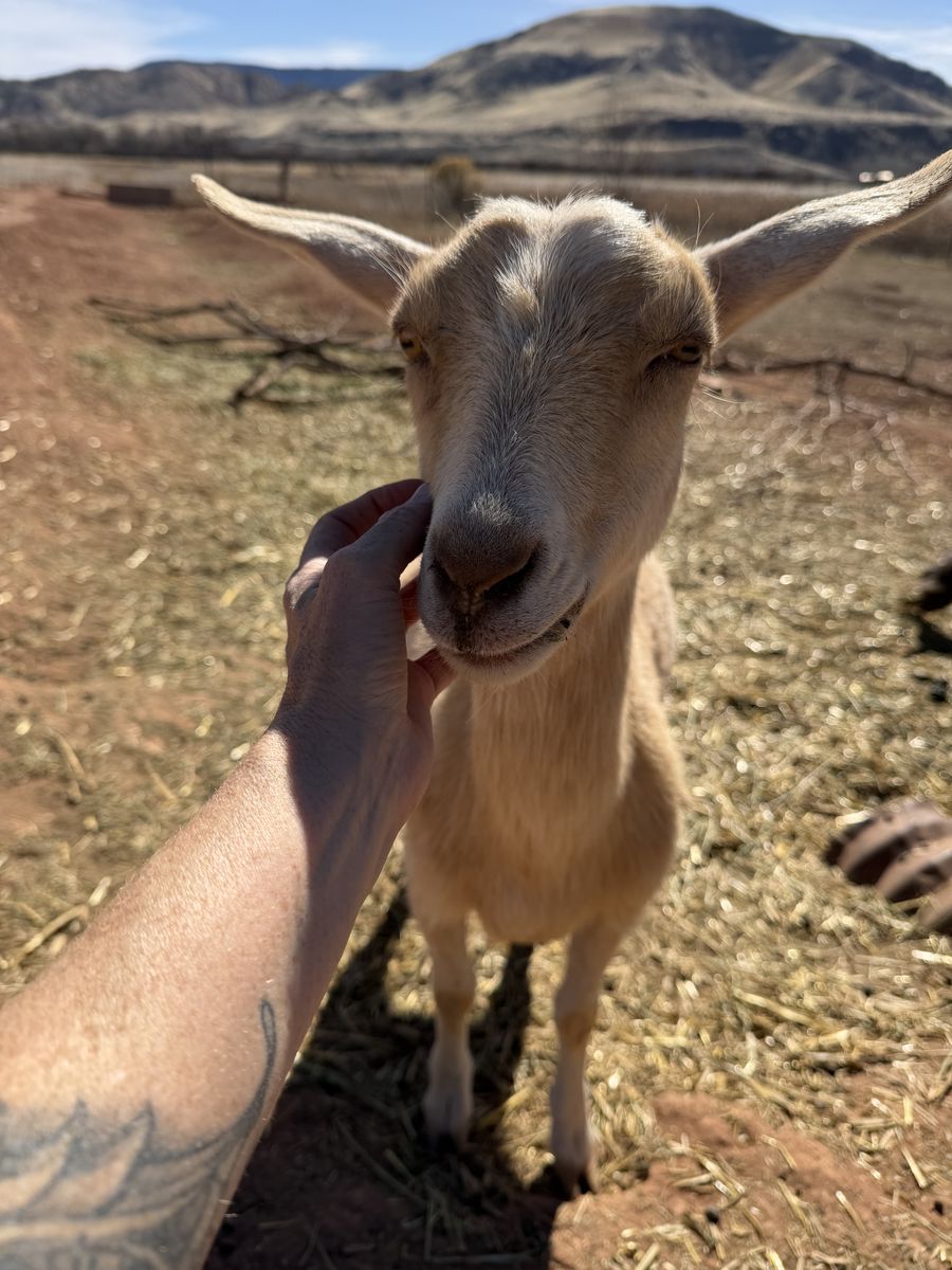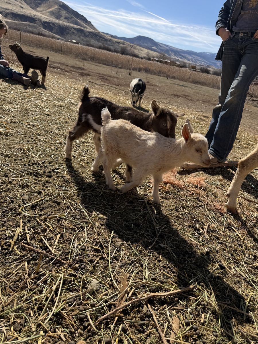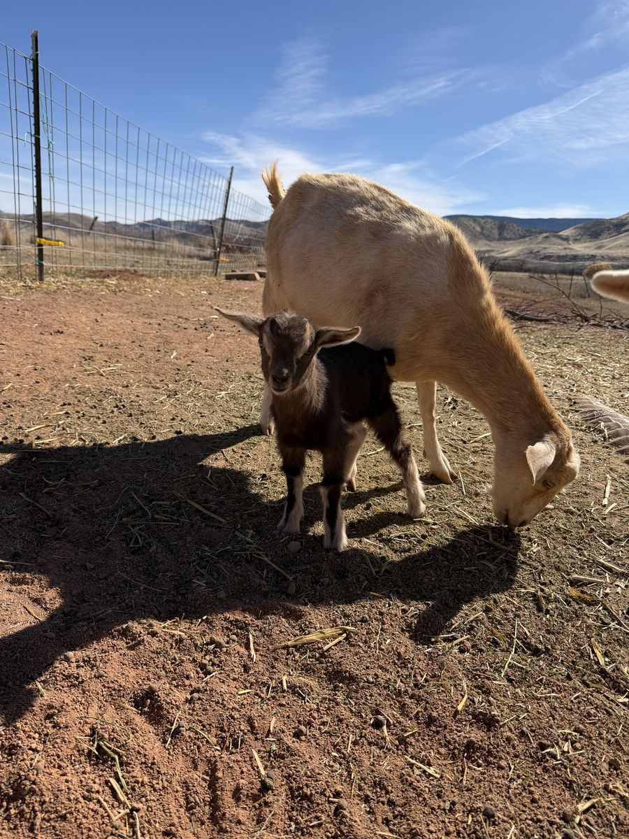 Two year old nanny goat with a buckling and a doeling at her side. Kids are about five weeks old. Super sweet mama (1/4 alpine, 3/4 Nigerian) who likes chin scratches. Kids sire is 100% Nigerian with blue eyes and painted.