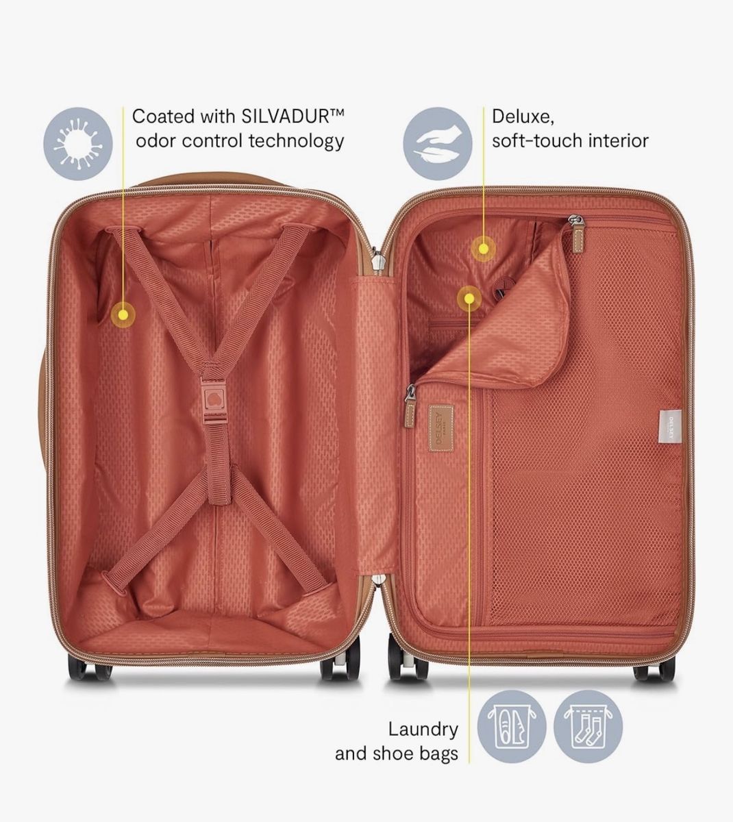 Lightweight textured basketweave 100% polycarbonate shell that is extremely resilient to cracking or breaking Dual Density, double-spinner wheels assure a stable base with multi-directional rolling with zero weight on your hand for easy travel; USB port provides trouble-free connection to USB devices for convenient charging (Charger not included) Recessed 3-dial TSA approved combination lock for security; features patented SECURITECH zip, a closing system that is 3 times more resistant to intrusion than a conventional zipper The lining is coated with SILVADUR technology to provide effective odor control; Exterior dimensions 21.75 x 13.75 x 10 Inches (includes handles & wheels); Interior dimensions are 19 x 12.5 x 9.75 inches Ergonomical handle for easy maneuverability and soft-grip side and top carrying handles; includes laundry bag, shoe bag and mesh zippered pockets for additional organization
