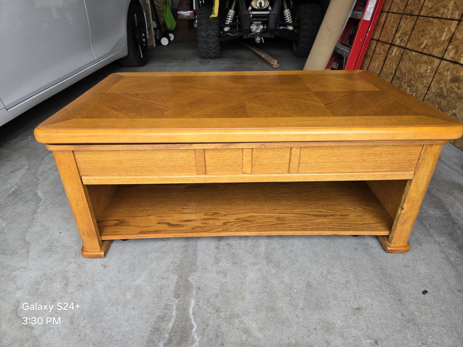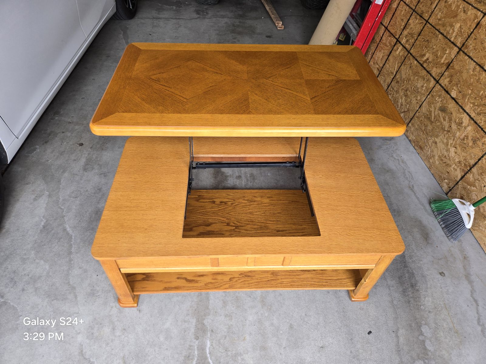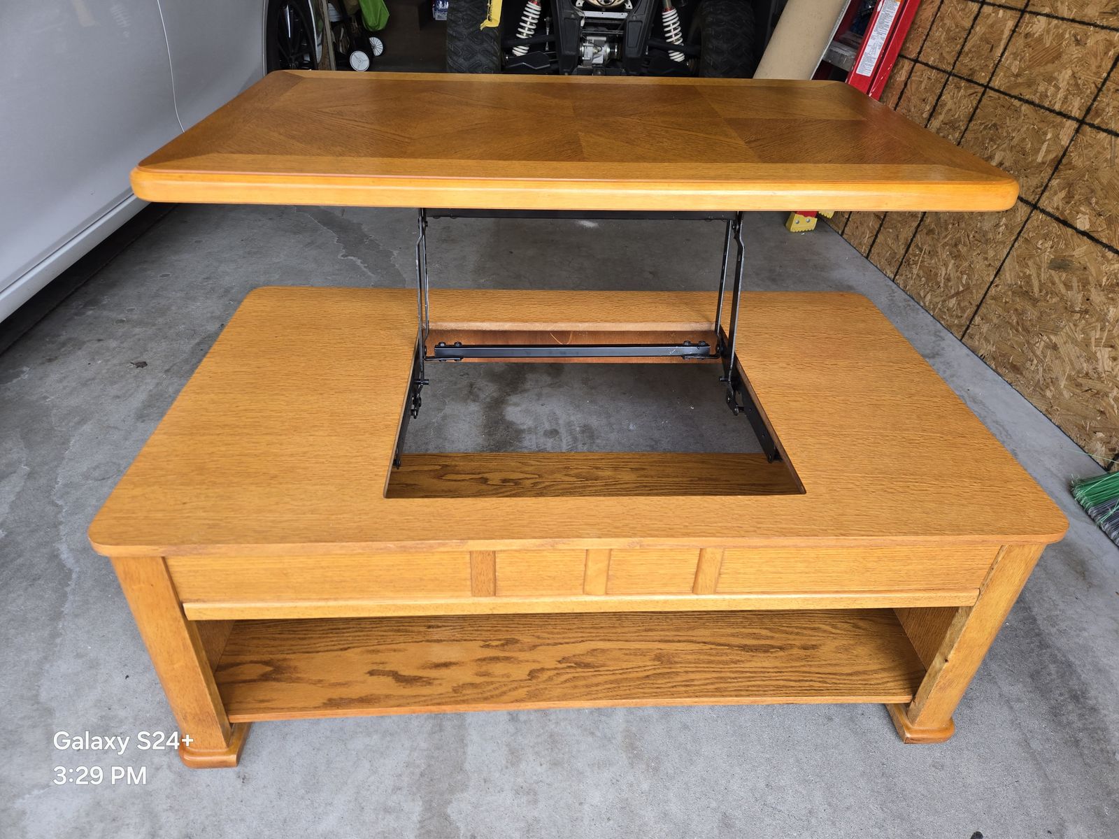Nice oak motion coffee table with bottom shelf in very good condition. Measures 27" x 45", 18" tall up to 28" tall when extended. Cash only.