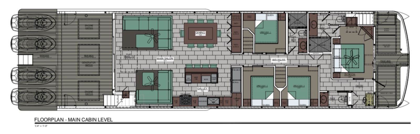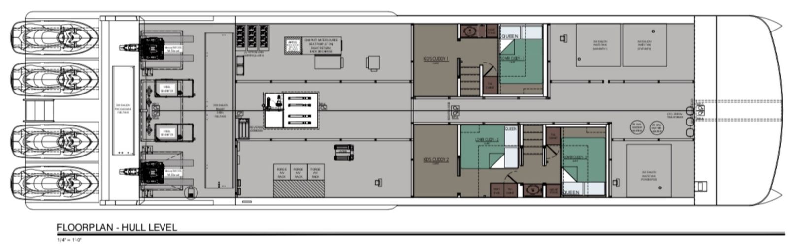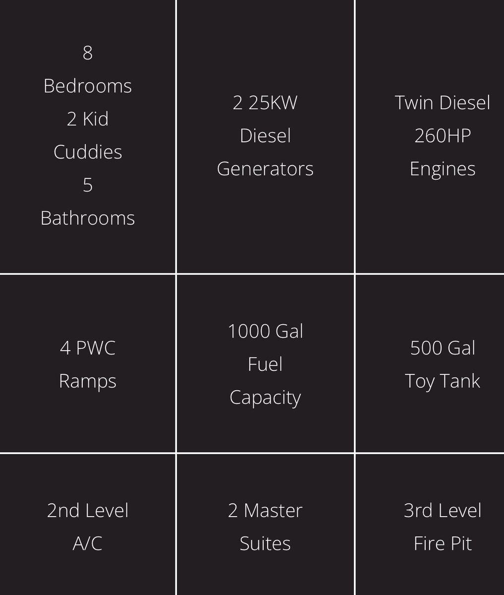 87' x 22', 8 bedrooms, 2 kuddies, 5 bathrooms, 1000 gal fuel, 500 gal toy tank, 3rd level firepit. 2 25 w diesel generators, 4 PWC ramps with electric winches, retractable side platforms, bow thrusters, slip in Antelope right in front of valet boat ramp, comes with boat owned side by side.