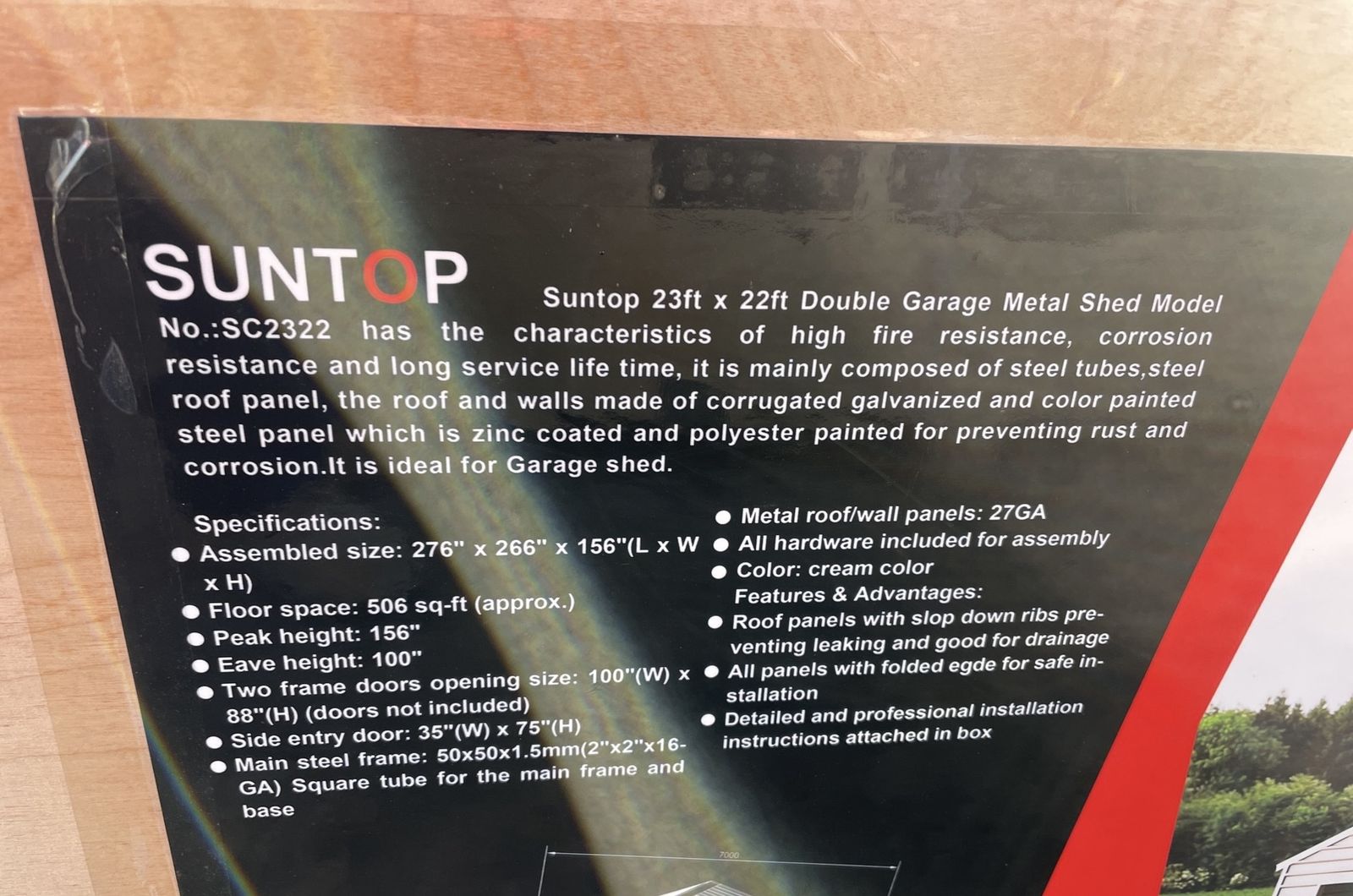 23 ft wide, 22 ft deep, and 13 ft tall. Brand new in box. Cream colored building.