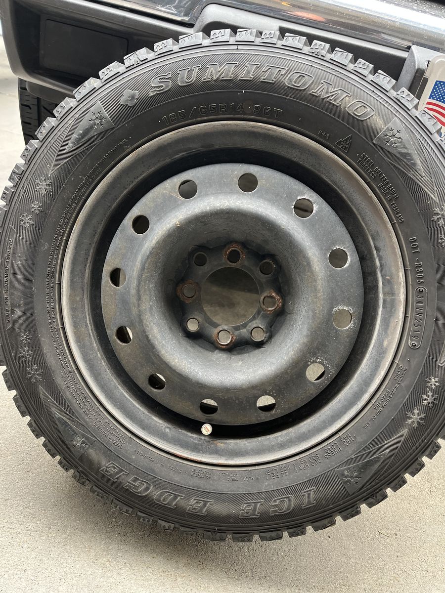 Four 185/65R14 sumitomos tires. Bolt pattern is 4x4” and/or 4x4.5” on black steel wheels.