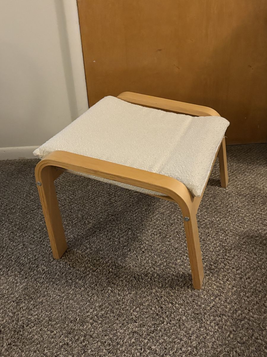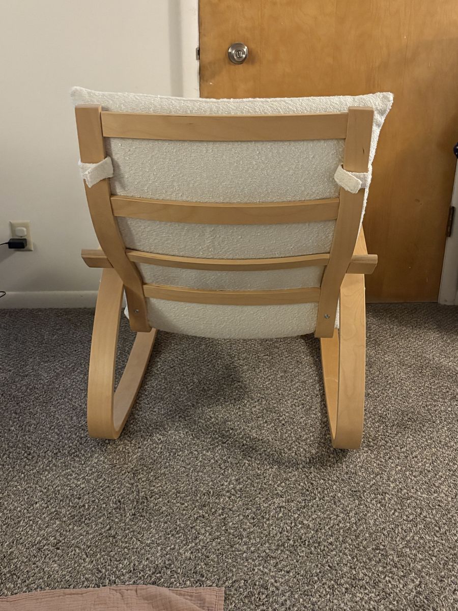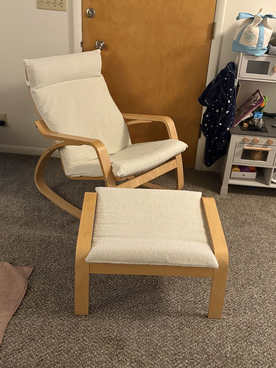 VenmoUsed but very nice condition Ikea POÄNG Rocking Chair and Ottoman. There is normal wear and tear, minor dents on the wood frame but nothing major. The original fabric of the chair and ottoman cushions is navy blue, but I have brand new offwhite boucle covers (from Rockin Cushions) on as you can see in the photos. The covers can be easily removed and washed too.
