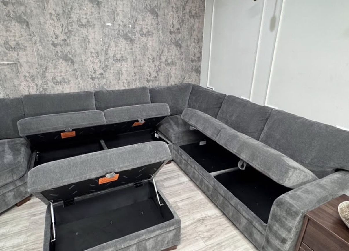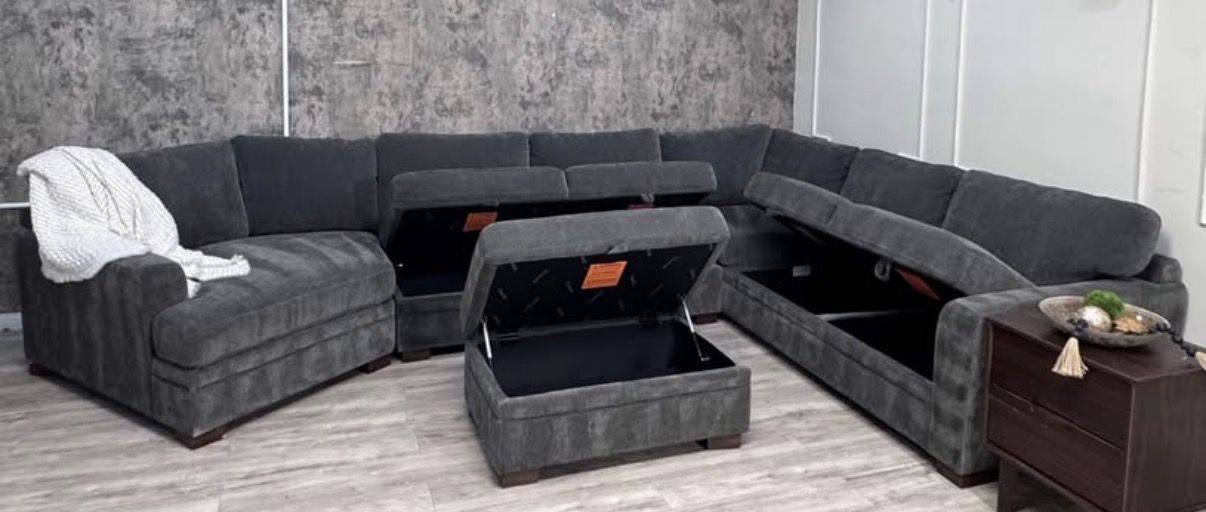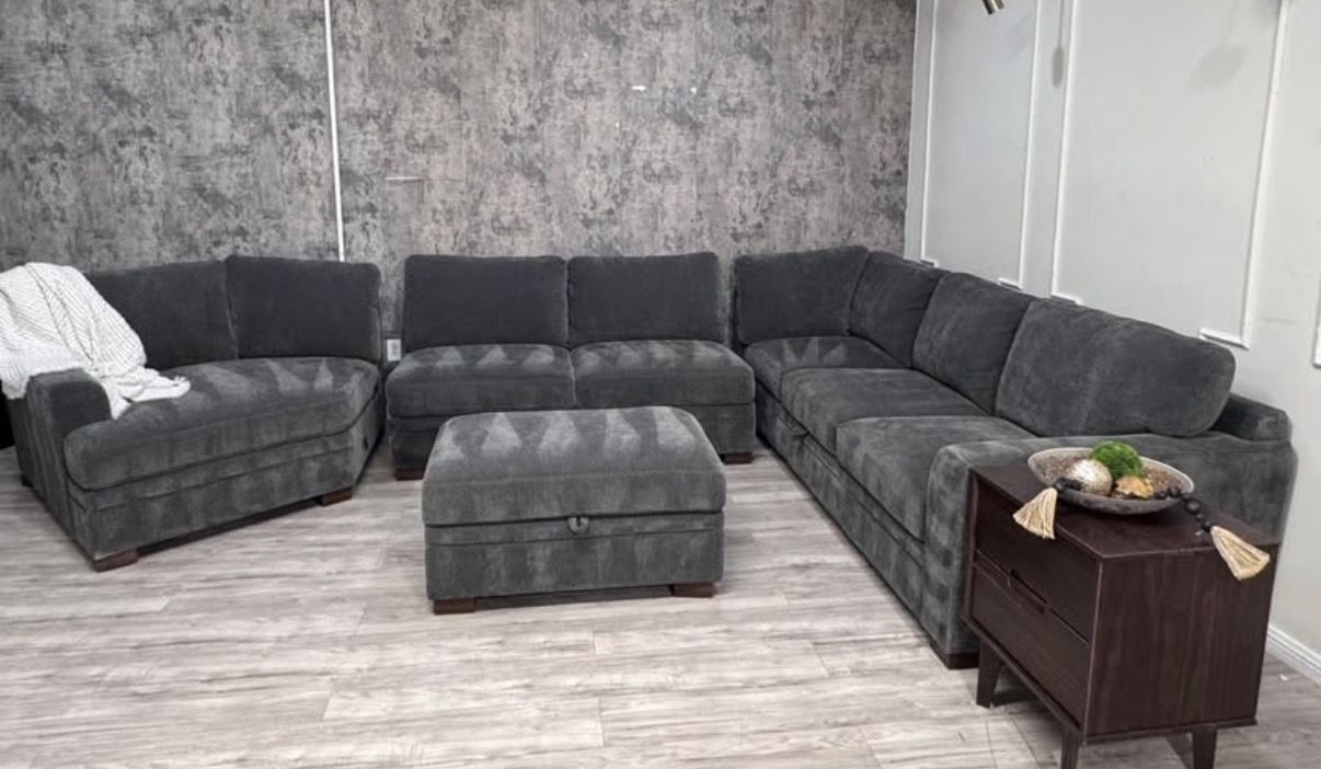 L-Shaped Sectional with Storage in 4 Seats Angled Oversized Corner Chair Design Attached Seat Cushions and Zippered Back Cushions Solid Wood Legs Soft Mailbox-Style Arm with Smooth Curve