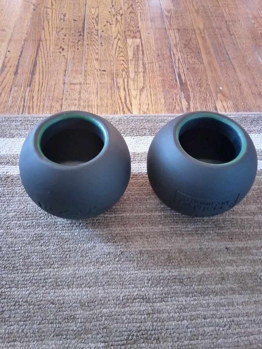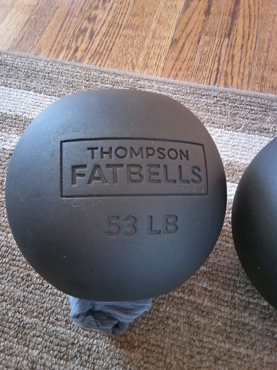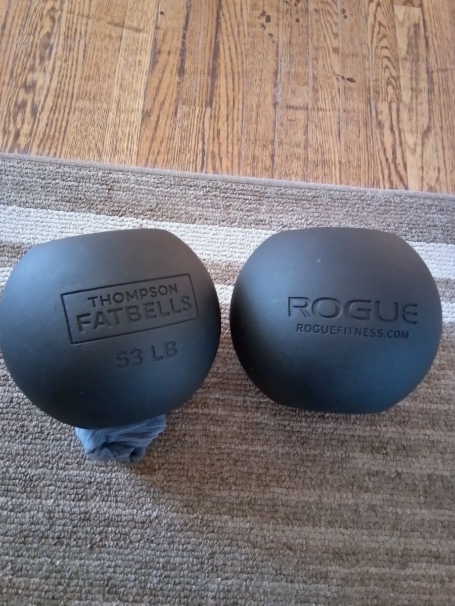 Rogue Fitness Thompson Fatbells 53lbs pair (106lbs total). Donnie Thompson invention mixing features of a dumbbell and kettlebell. Cast iron bell with a handle inside the bell. Cash only.