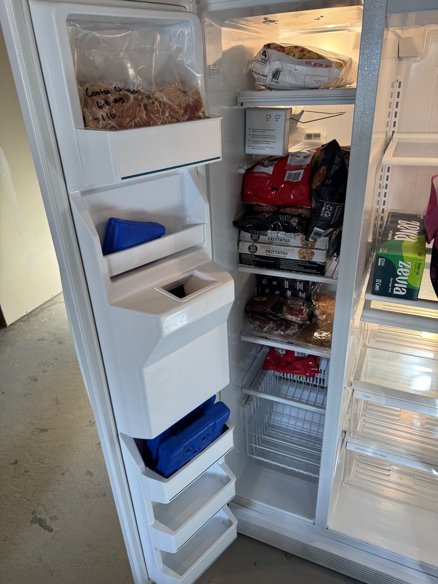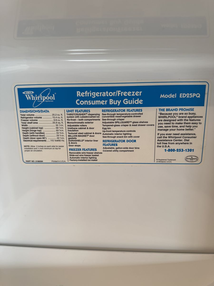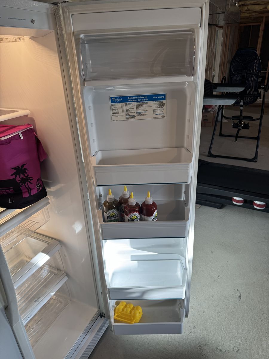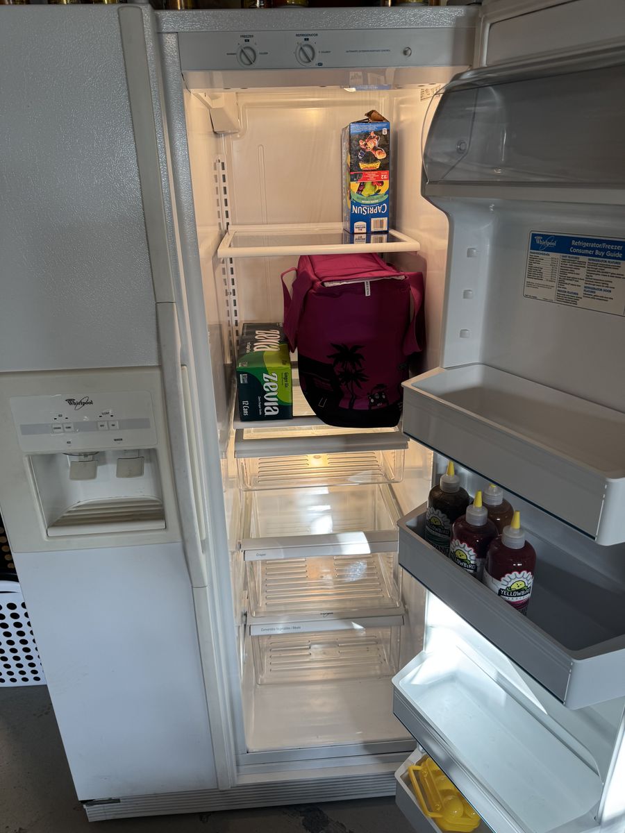ApplePayClean and fully working Whirlpool side-by-side refrigerator/freezer (Model ED25PQ). Great extra fridge for a garage, basement, or rental.