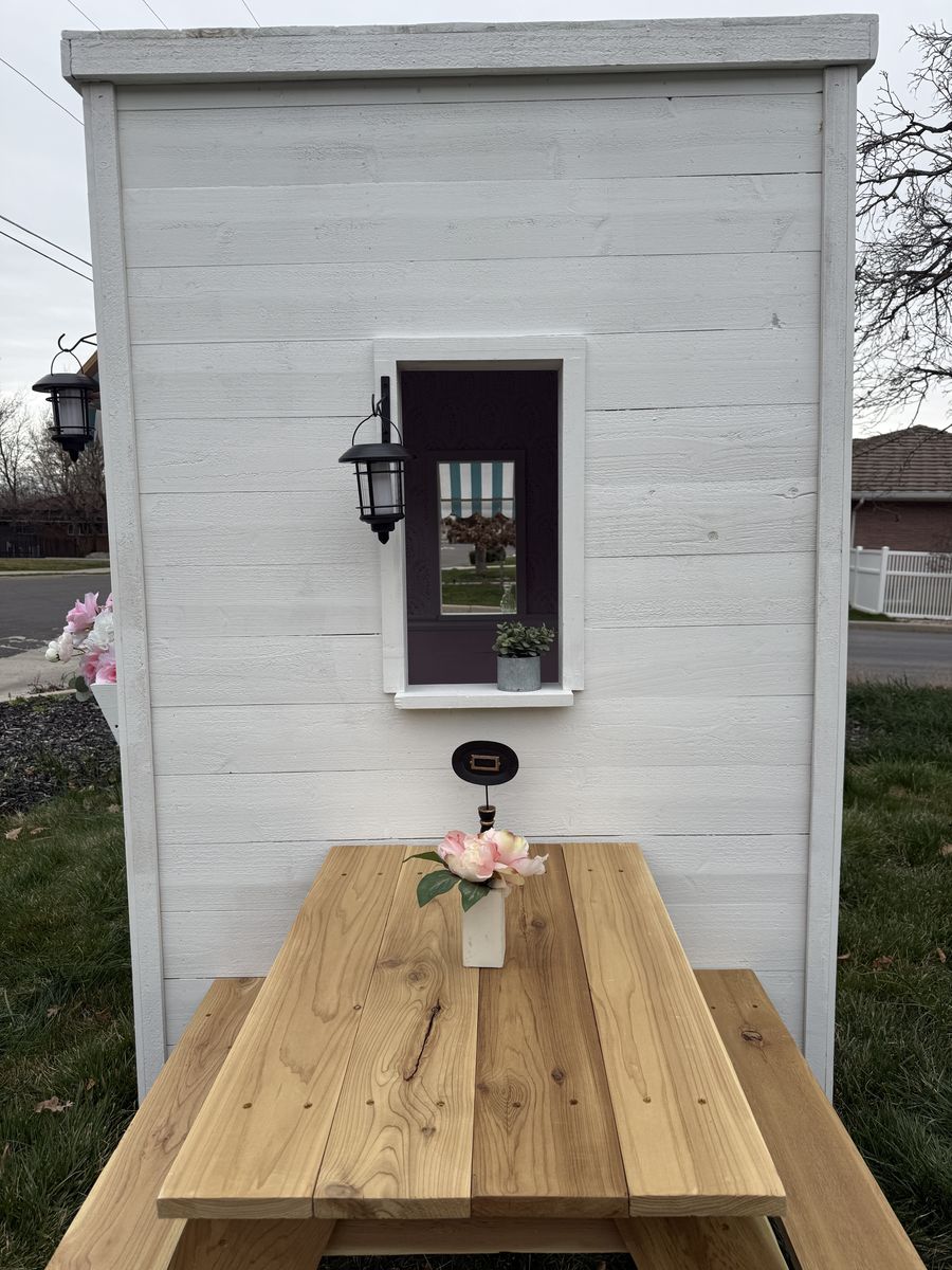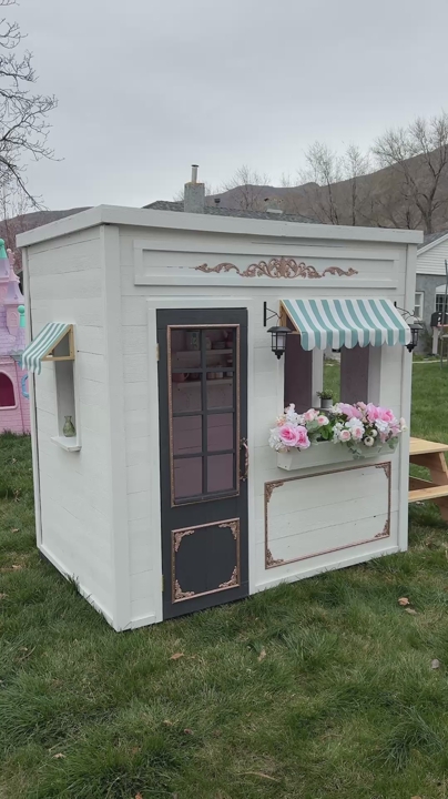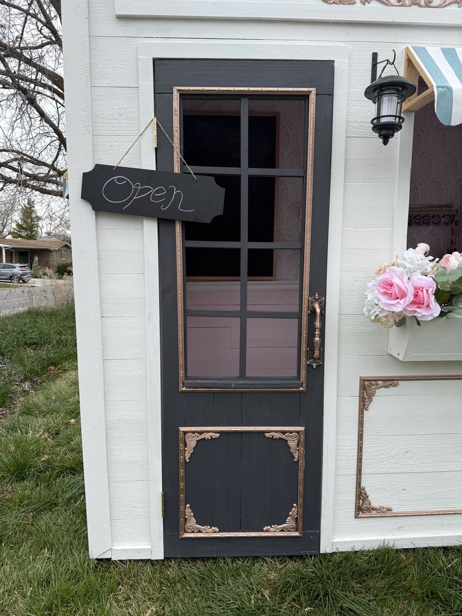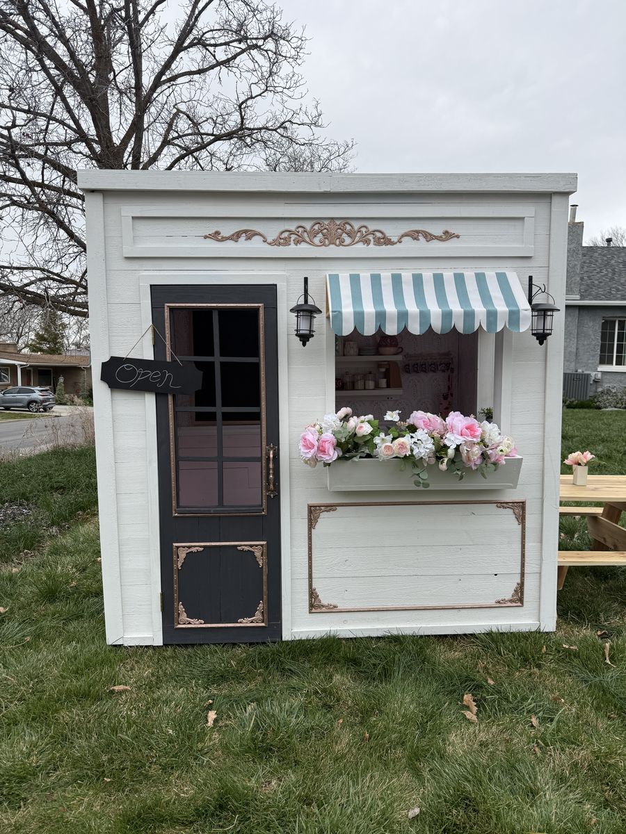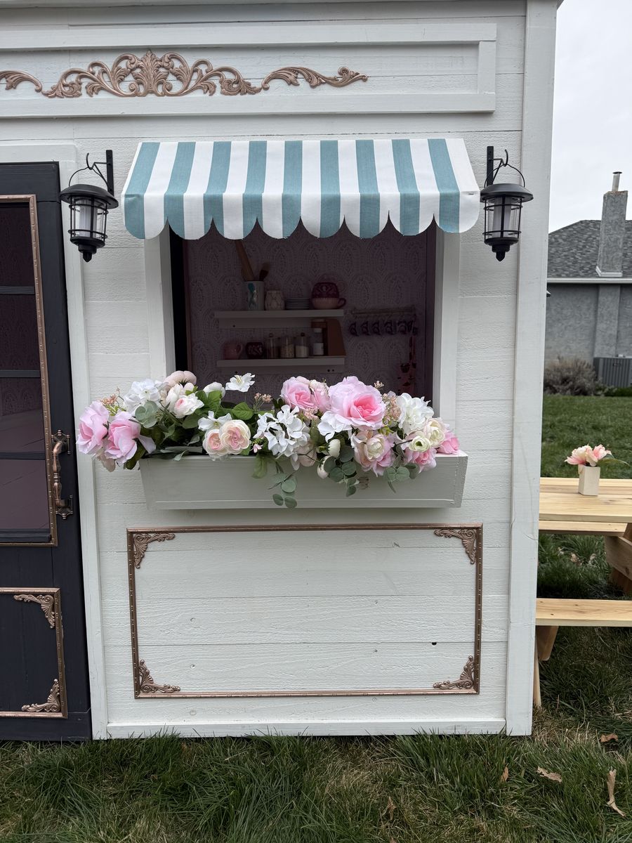 The Details: • The Vibe: It has a clean white exterior with a grey door and some really pretty gold trim. • Day & Night Play: I added solar-powered lanterns that kick on at sunset, so it looks magical in the evening. • Inside Perks: The interior is finished with real wallpaper. Two shelves for cafe ingredients. Cup holder for tea cups or smocks. • Exterior Perks: It has those classic teal-and-white striped awnings over the windows and a built-in flower box ready for some spring petals. Includes a solid wood table for little guests or customers.