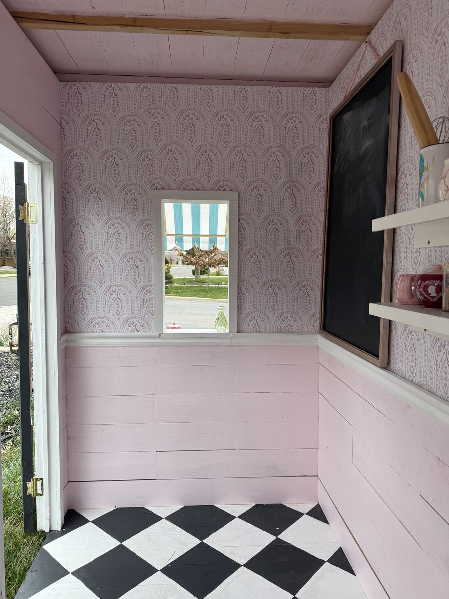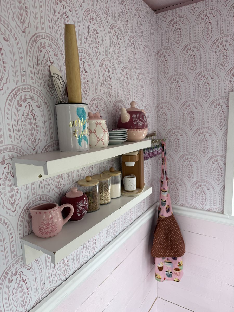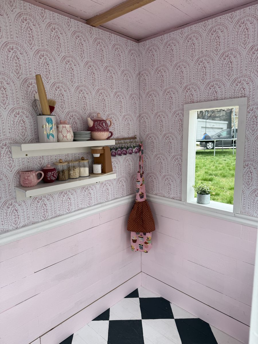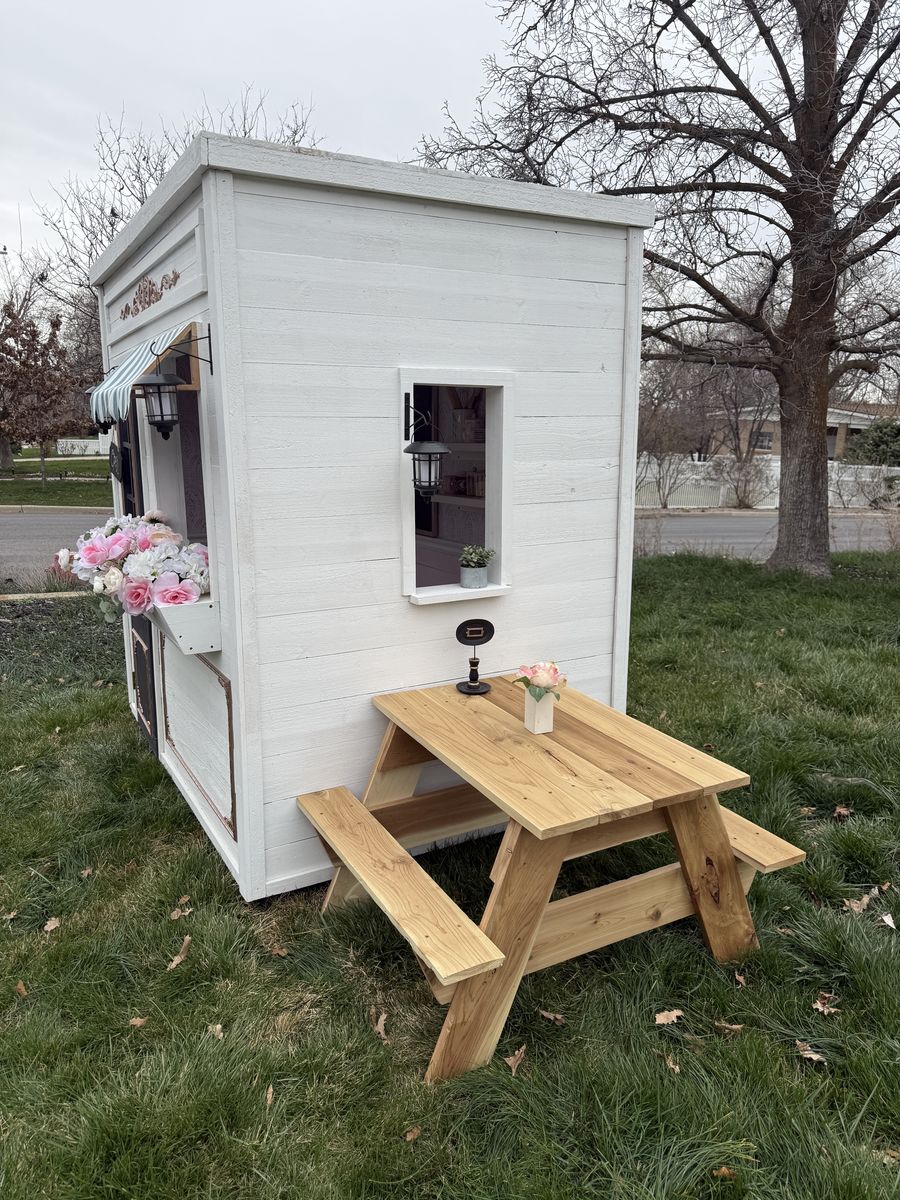 The Details: • The Vibe: It has a clean white exterior with a grey door and some really pretty gold trim. • Day & Night Play: I added solar-powered lanterns that kick on at sunset, so it looks magical in the evening. • Inside Perks: The interior is finished with real wallpaper. Two shelves for cafe ingredients. Cup holder for tea cups or smocks. • Exterior Perks: It has those classic teal-and-white striped awnings over the windows and a built-in flower box ready for some spring petals. Includes a solid wood table for little guests or customers.