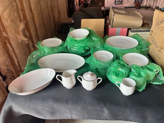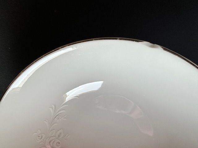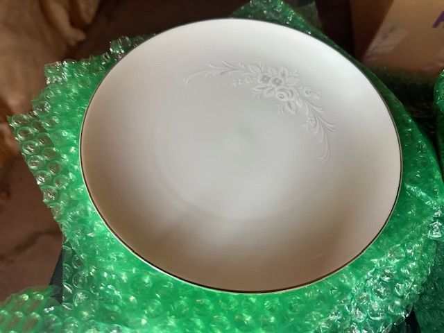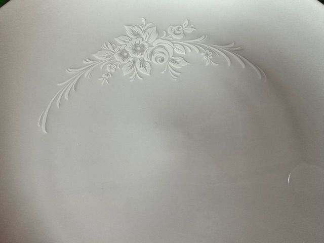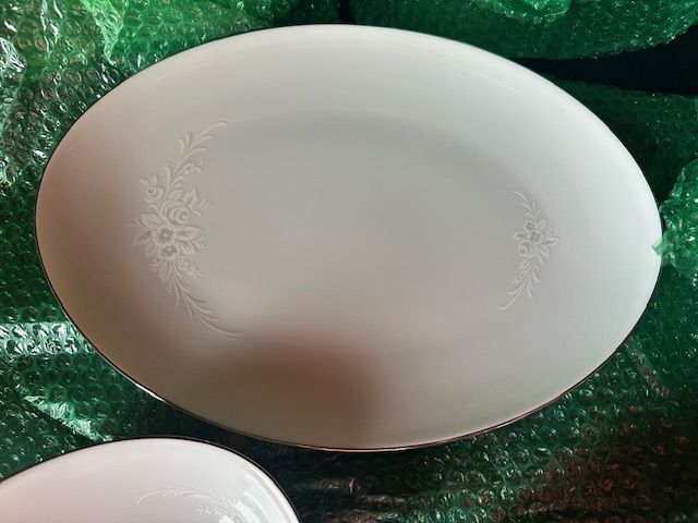 ApplePayThis beautiful Sango China Cantata design is vintage from 1972. The soft floral pattern is on round, white porcelain dishes with a shiny finish and silver edging. There are 5 full dinner place settings with extra pieces, including: 8 dinner plates, 6 soup bowls (one is chipped as documented in photo), 8 salad plates, 8 roll plates, 8 saucers, 5 tea cups, 1 large oval platter, one small oval platter, 1 cream & sugar set.
