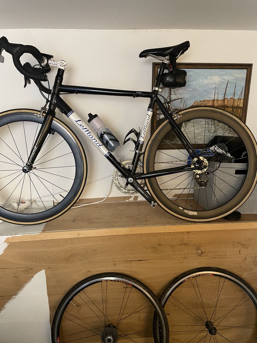 VenmoLeMond Etape road bike, year unknown but roughly 2005 give or take. Outside of the frame and fork most of the bike has been updated: