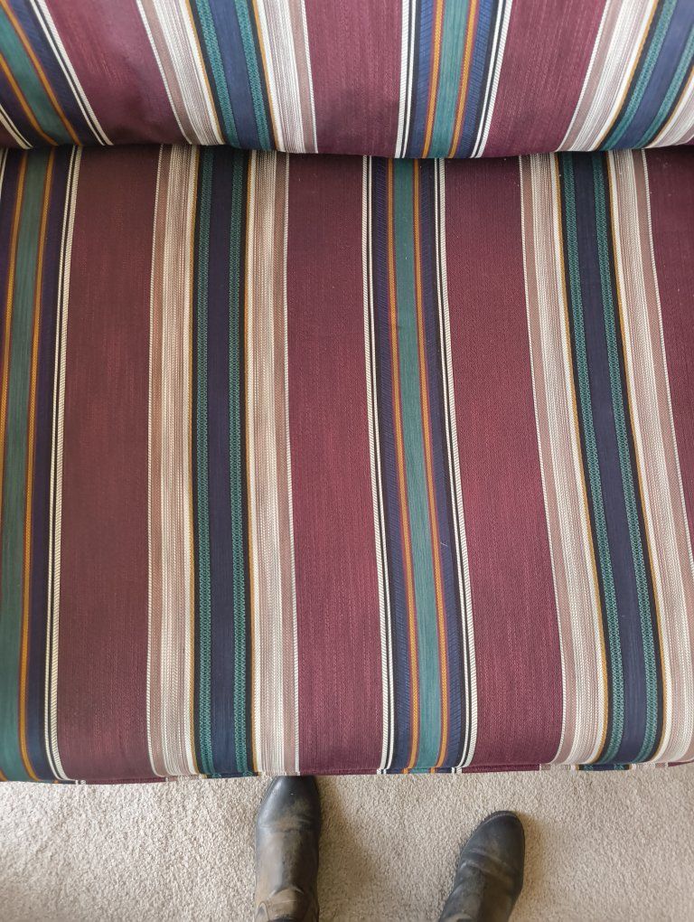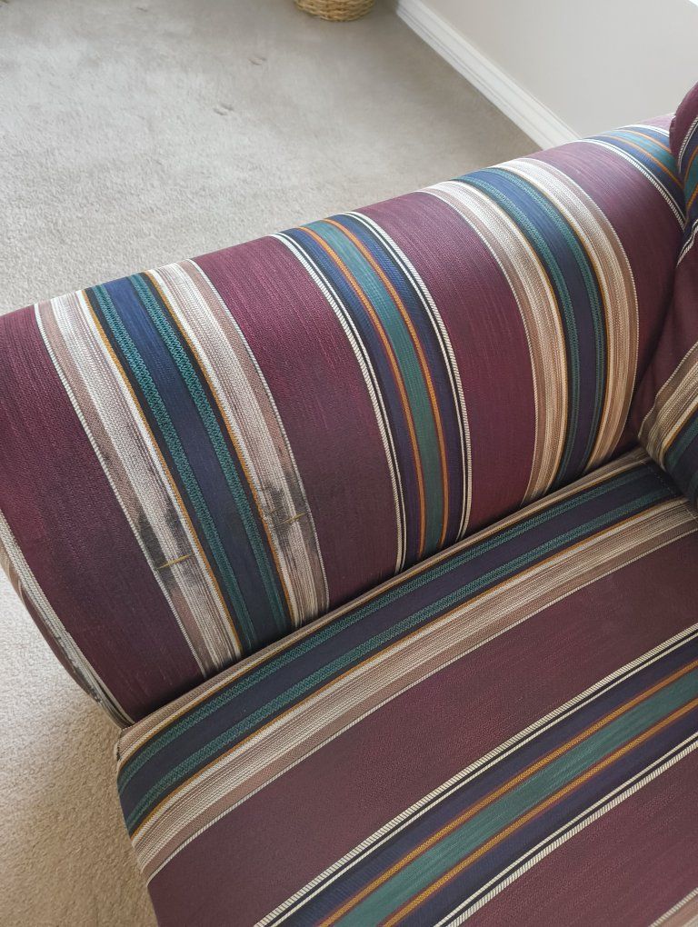 Sofa and loveseat, gently used, only worn spot on left arm on loveseat. shown in last photo. burgundy, navy, green stripe.