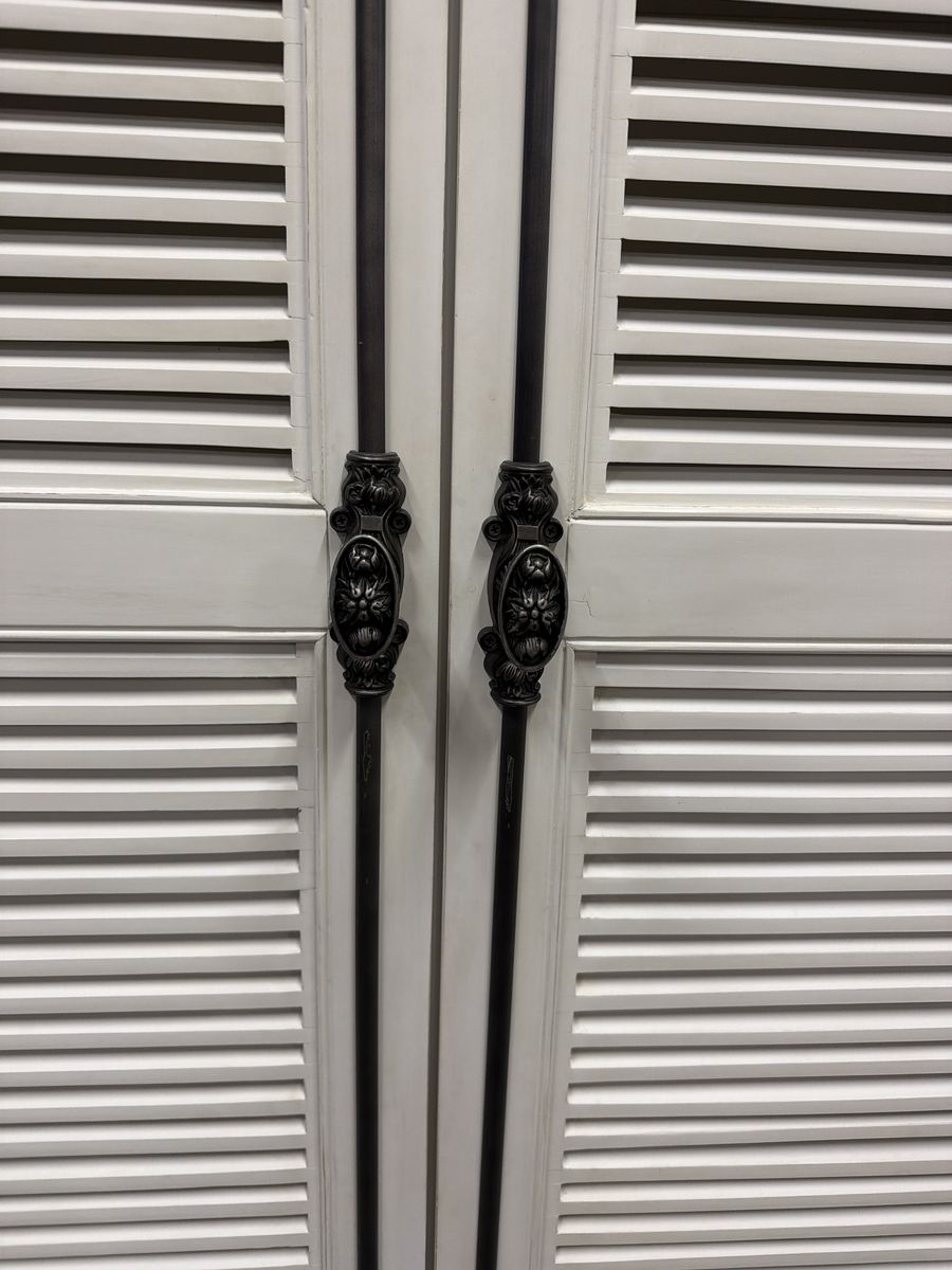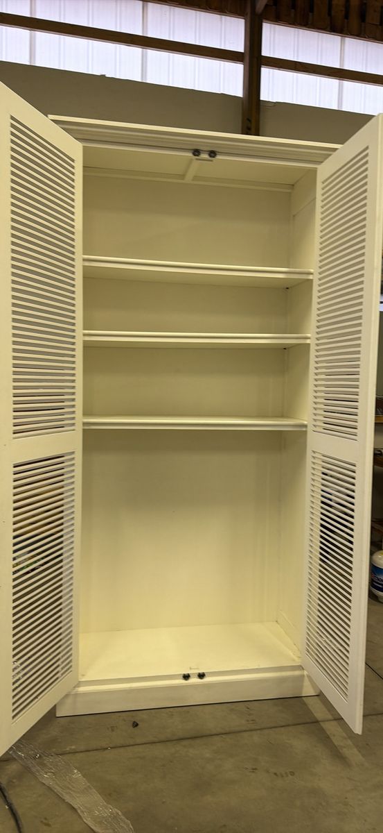 Beautiful tall farmhouse cabinet with shutter-style doors and black hardware. Perfect for pantry storage, linen cabinet, or clothing armoire.