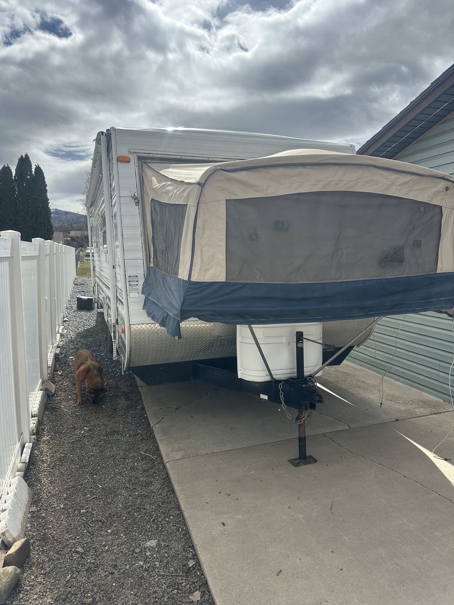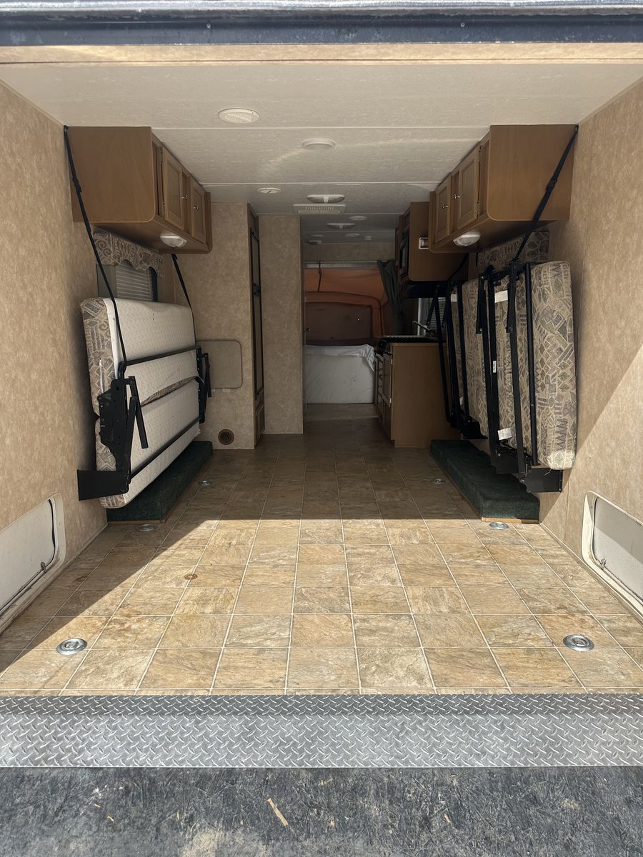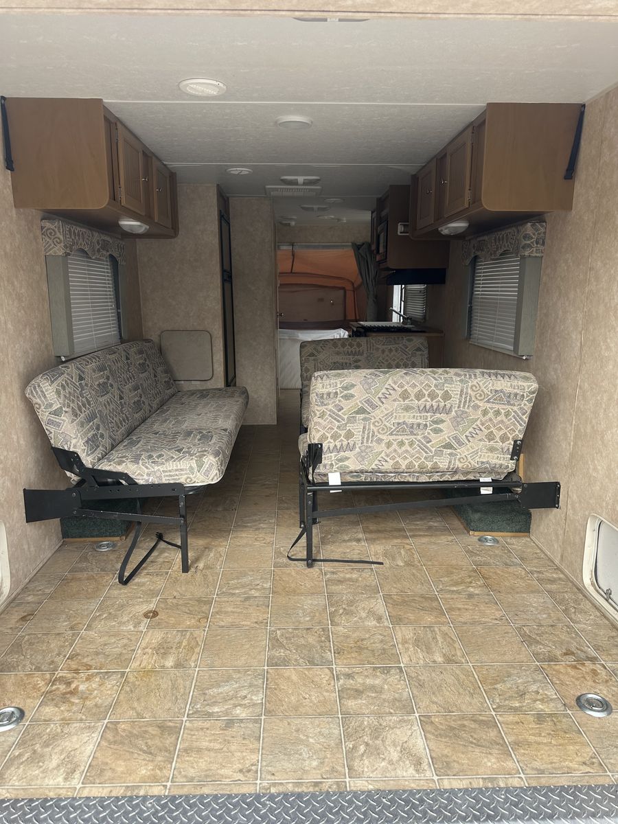 We are selling our toyhauler. This is half ton towable and can fit some sxs. Everything works including furnace, A/C, stove, toilet & shower. The trailer is covered in the winter and has no leaks. The trailer tows great and was able to hold our 4 four wheelers (2 large, 2 kids sized). It has a queen bed in the canvas fold out that has a few patches. Fold out bench/bed & dining seats that make another bed. Opening is 88” wide at gate 68 1/2” tall 131” deep to the cabinets 69” width at wheel wells Weight info is in pics. Thanks
