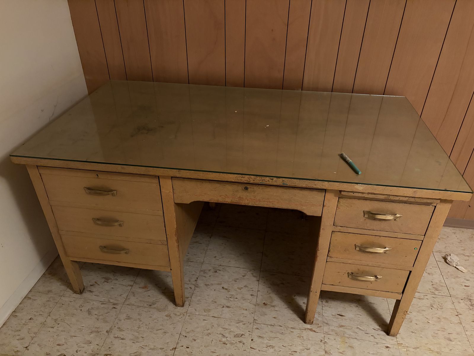 VenmoAntique desk has all the charm for an old office typewriter drawer to the left. Center drawer to the front. Organizer drawers to the right.