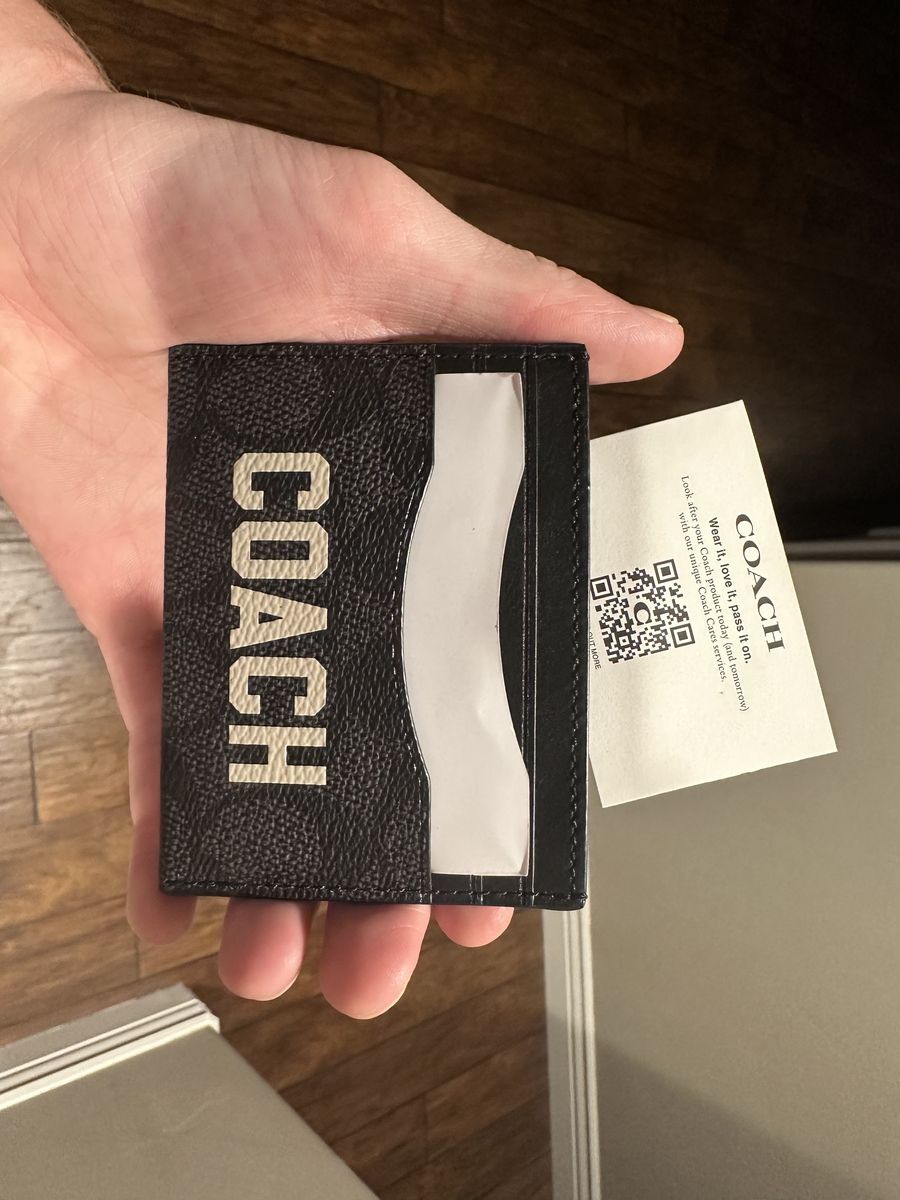 ZelleLike-new Coach slim card holder wallet. This was a wedding gift and has never been used—only taken out of the box. Still has the original inserts/cardboard and QR code card inside.