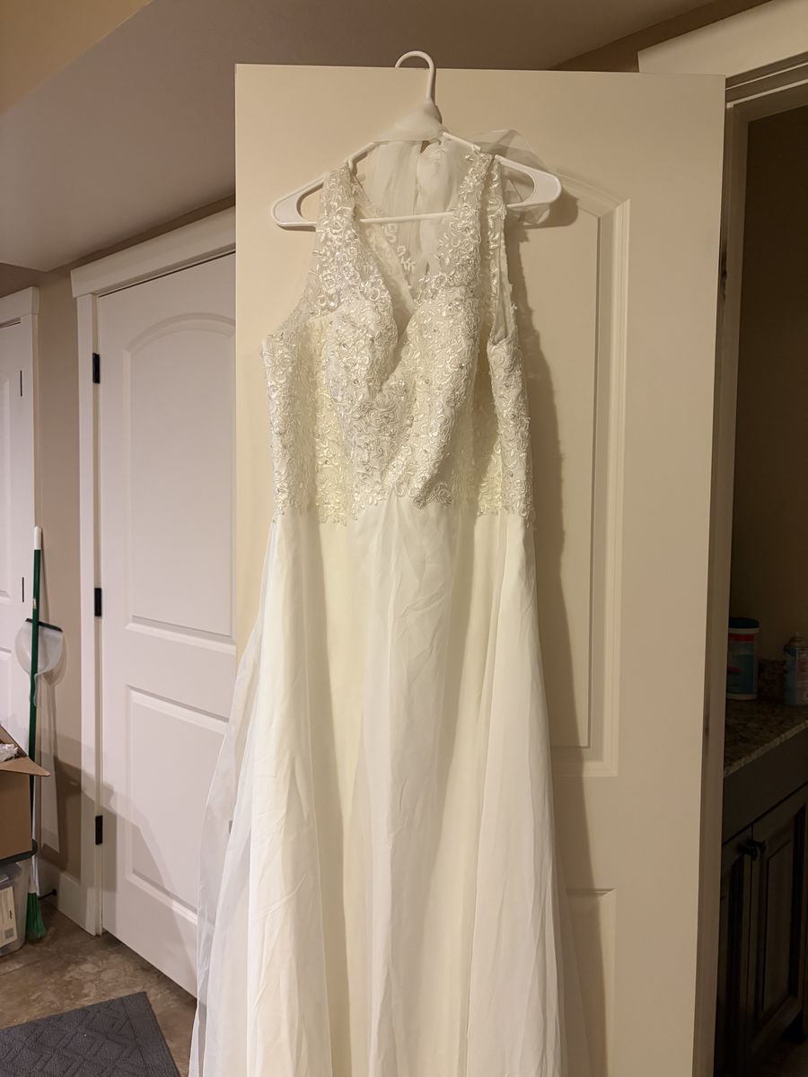 This is a wedding dress size 20w with a tiara and vail.