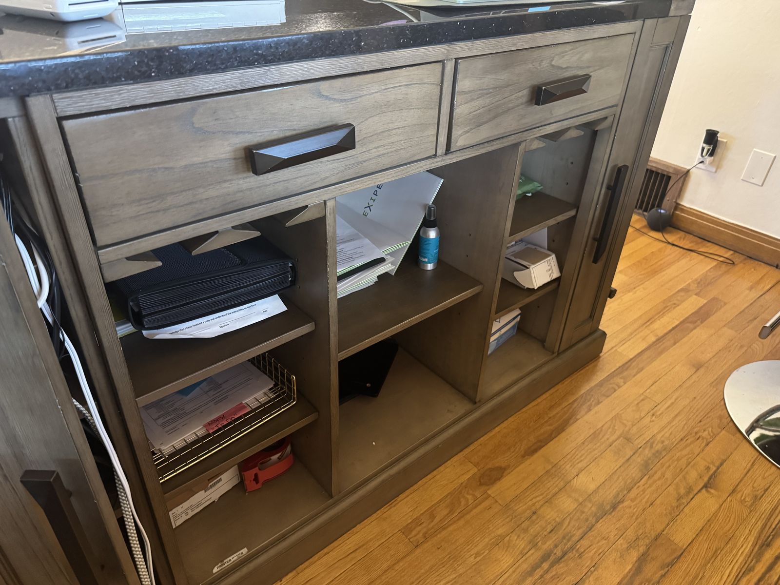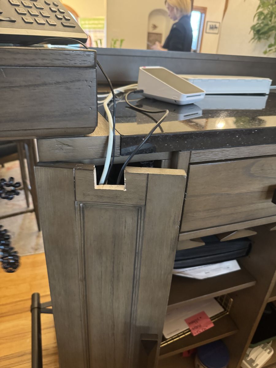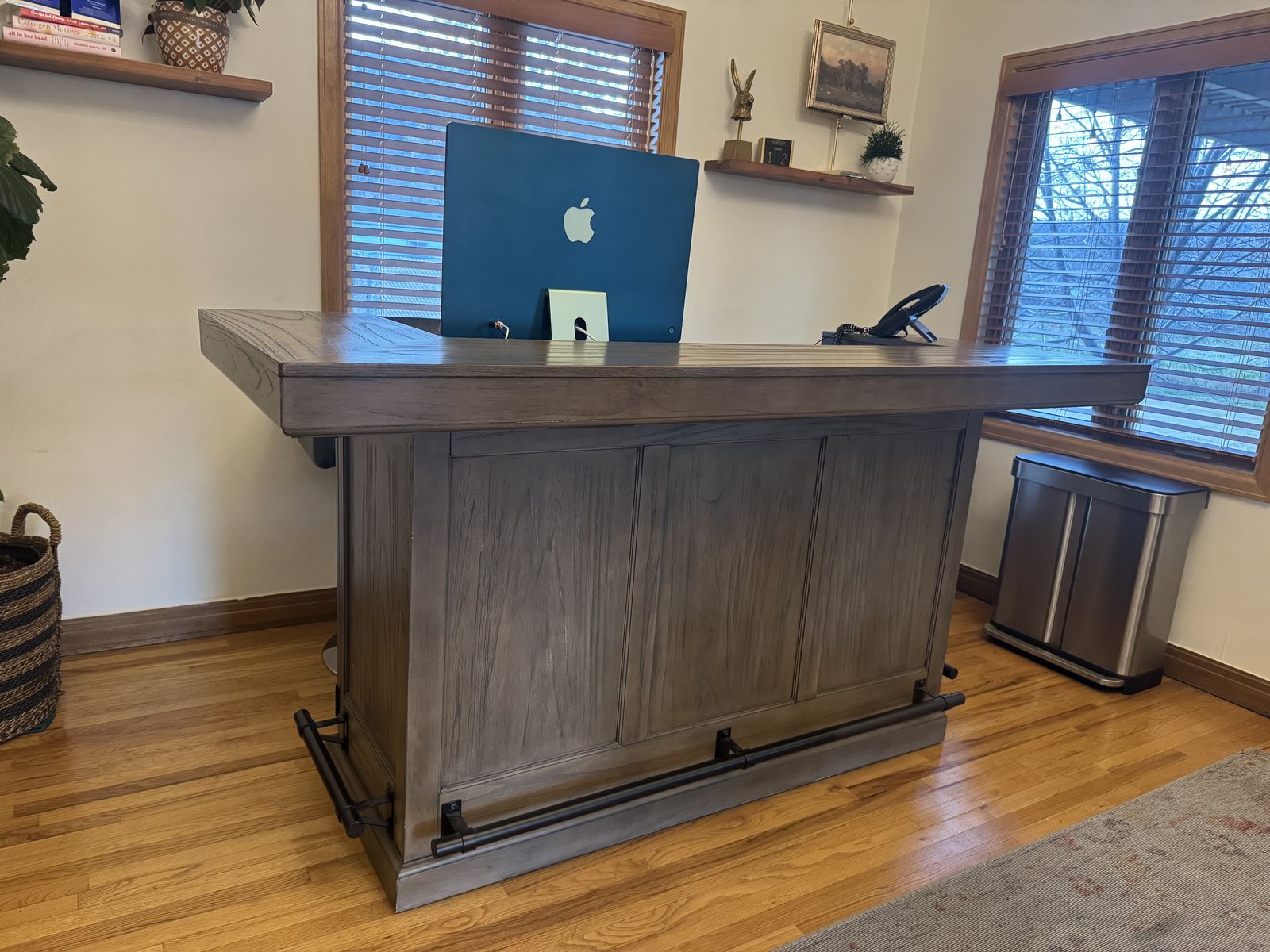 We have been using this nice heavy bar as a reception desk for the last year. It’s in great shape. There is a small cut out that was made for wires but it is otherwise great condition. We need something bigger now. It measures 78” long, 42” tall at the highest point, and width is 30.5”. Must be able to remove from the office on your own. New desk is coming any day now.