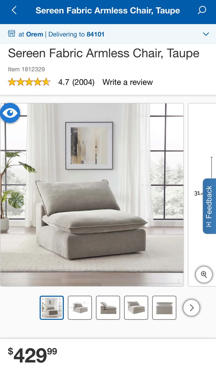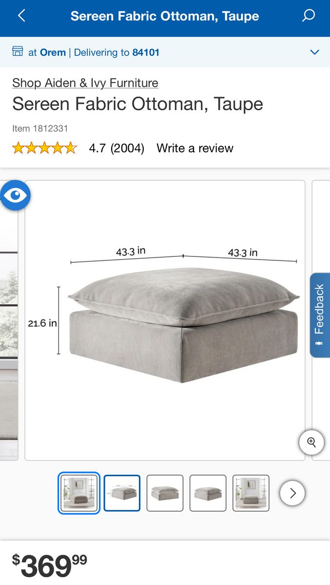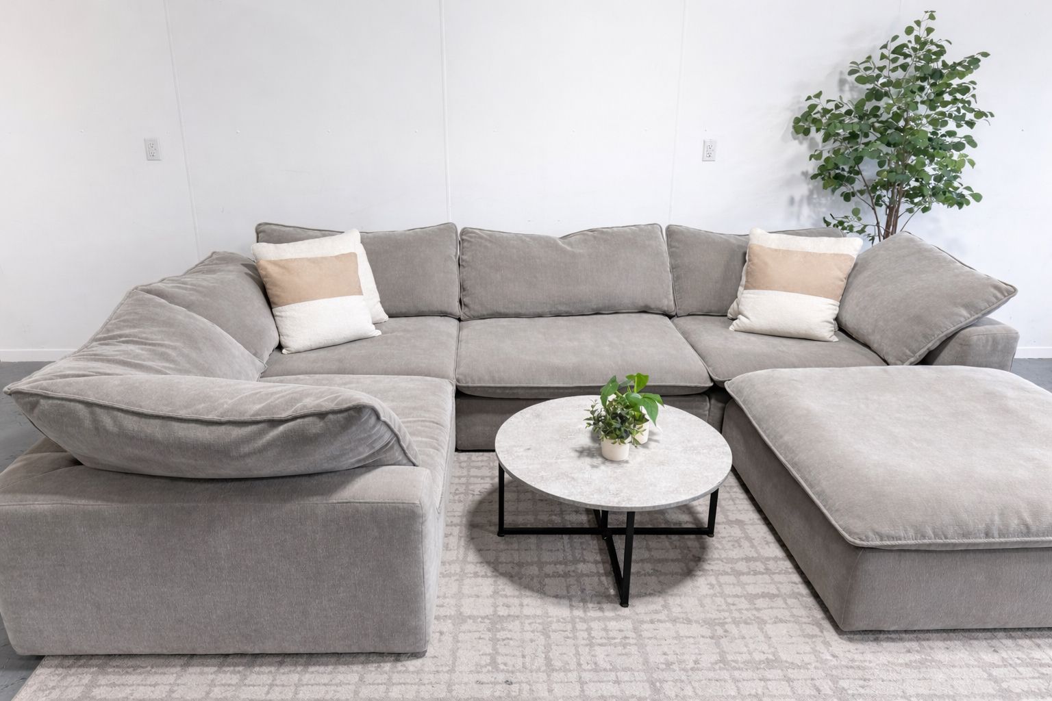 ZelleSpacious and ultra-comfortable Sereen 5-piece “cloud style” sectional from Costco. Taupe fabric makes it easy to match with any living room décor, and the large modular design offers tons of seating for families or entertaining.