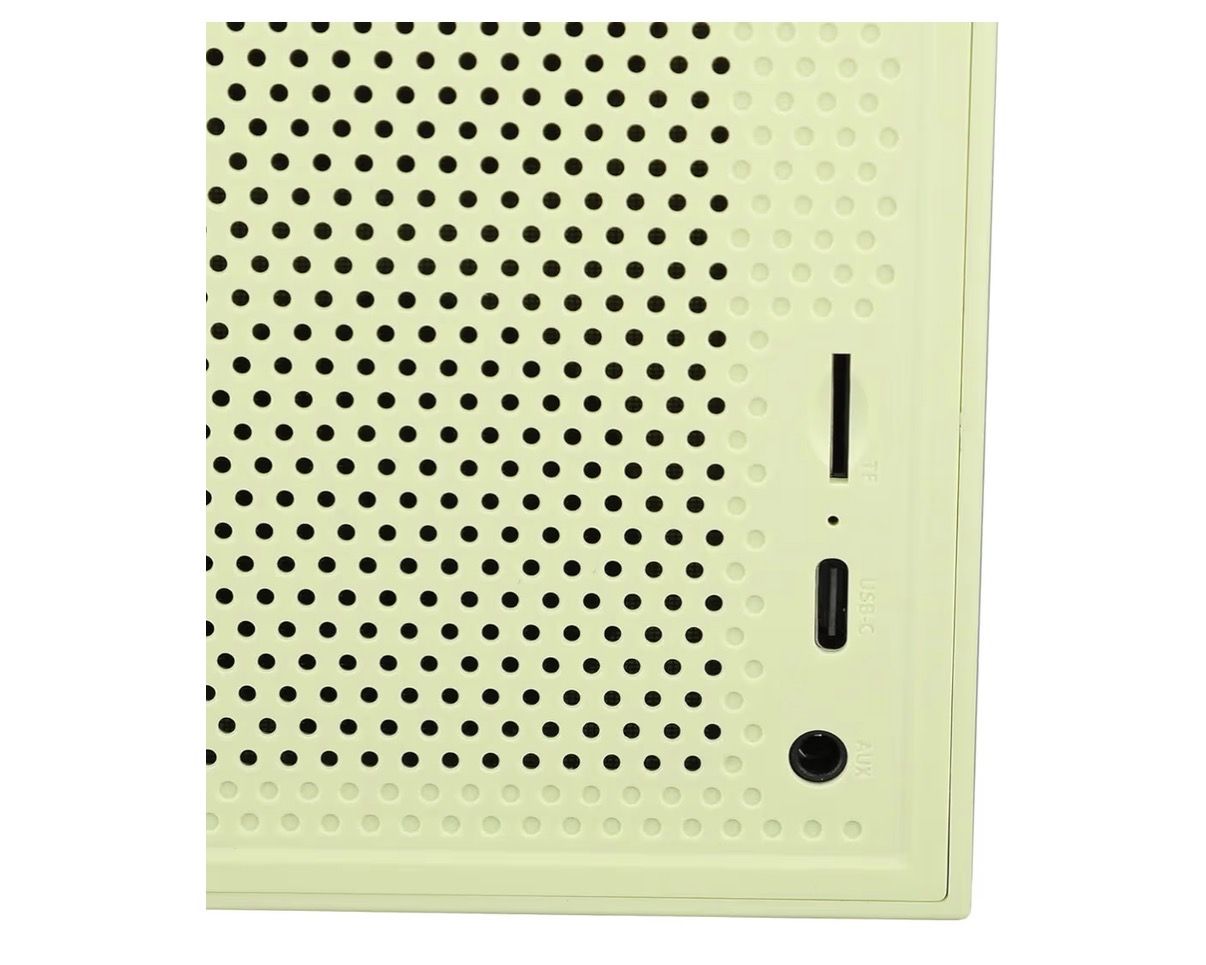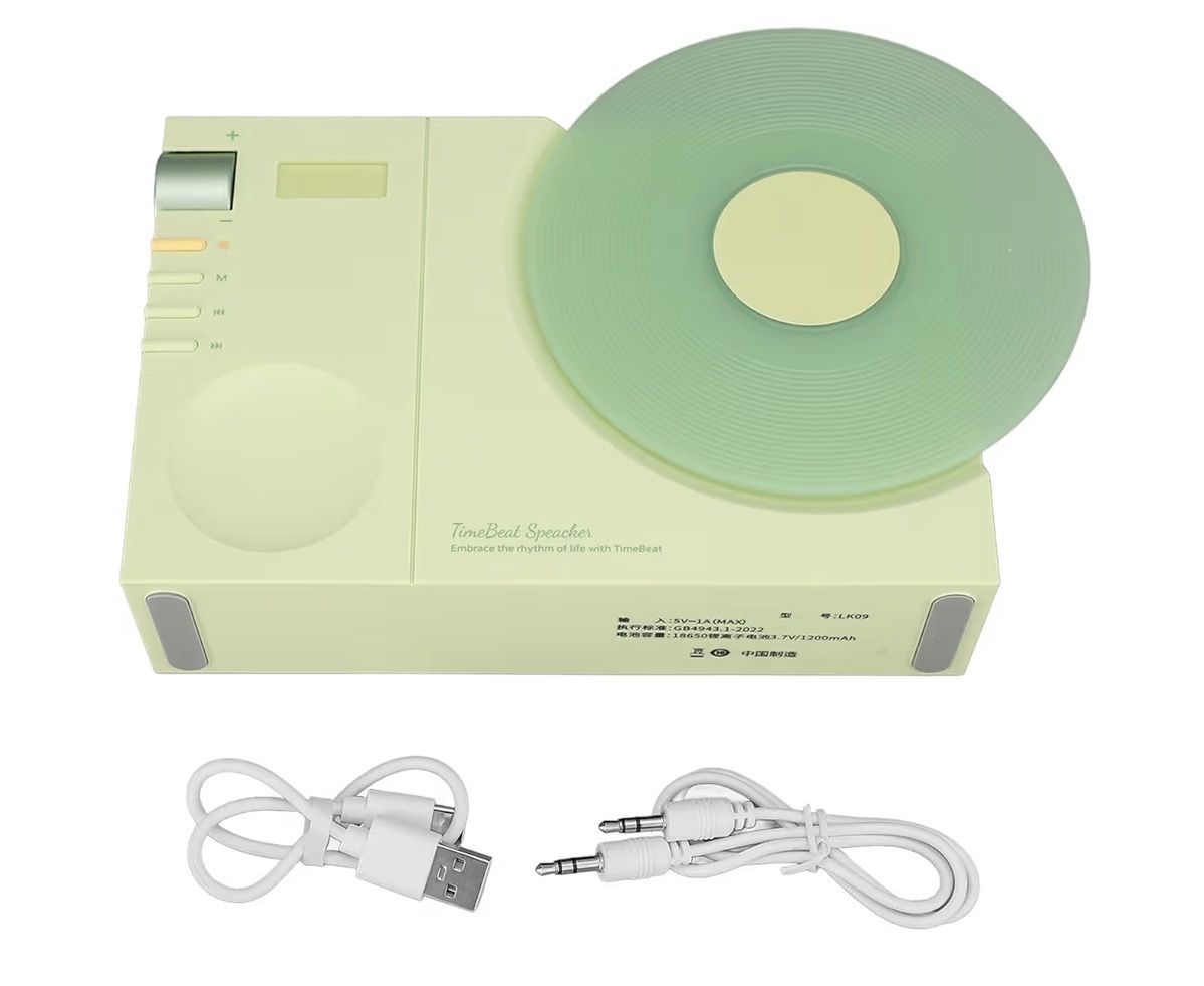 Features: • Bluetooth wireless speaker • Rotating “vinyl record” design • Built-in alarm clock • USB-C charging • AUX input and TF card slot • Compact retro design for desk or shelf