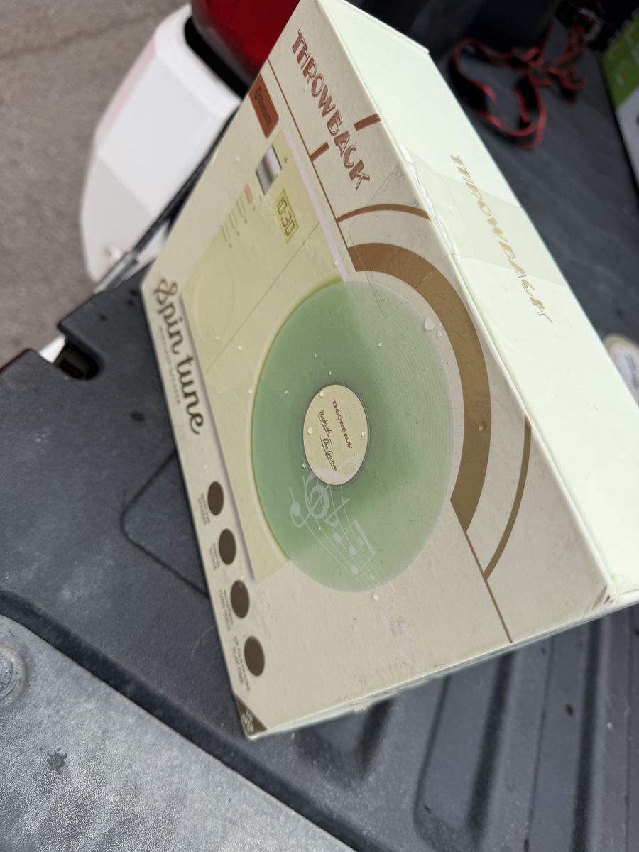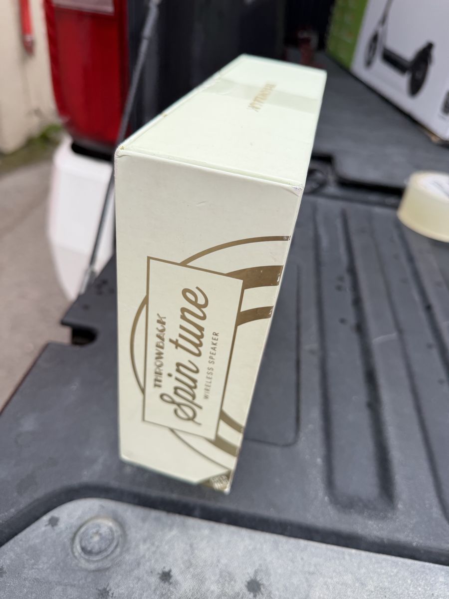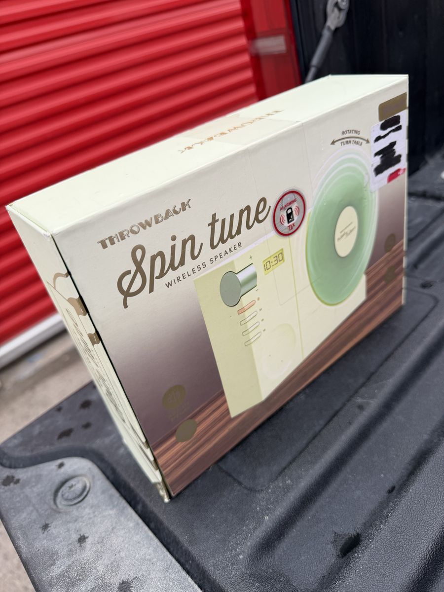 Unique Throwback Spin Tune Wireless Speaker designed like a retro record player. The vinyl-style disc spins while music plays, giving it a cool vintage look.
