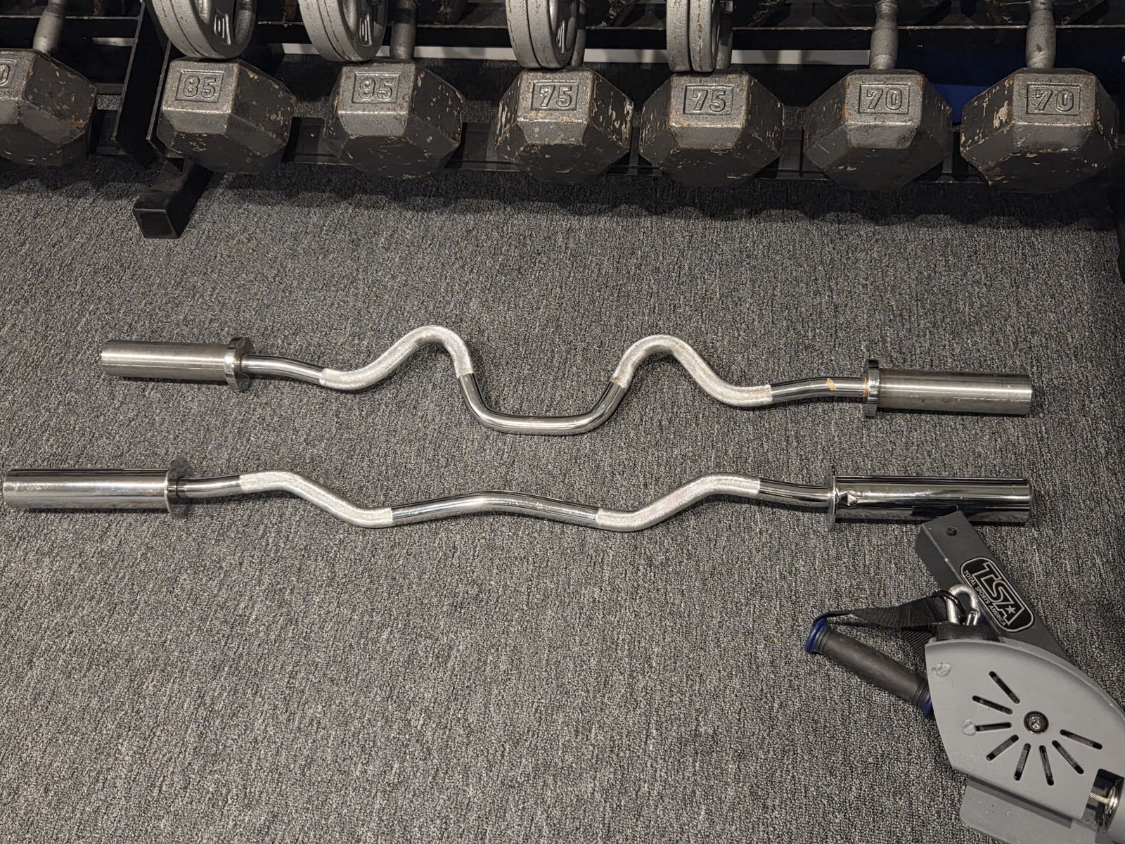 Nordictrack Strength Performance System, 540 lbs. Olympic Weight Set w/ rack, 2 olympic straight bars, 2 curl bars, weight clamps, dumbell set (pairs) from 30 to 100 lbs (80 lb set missing) a total of 1790 lbs., bench with leg extension